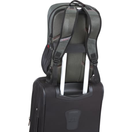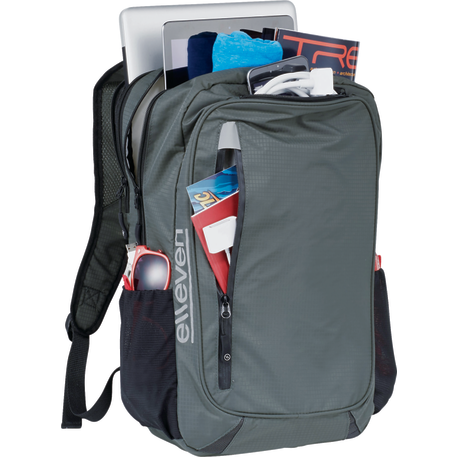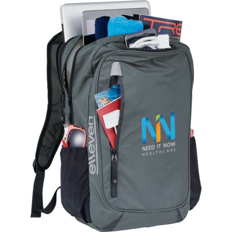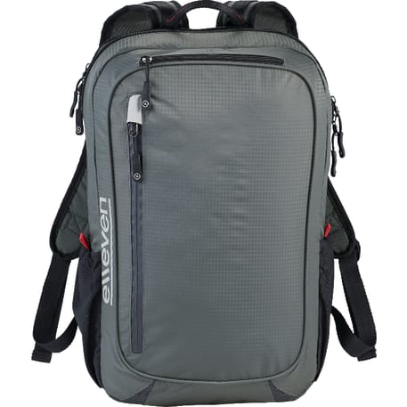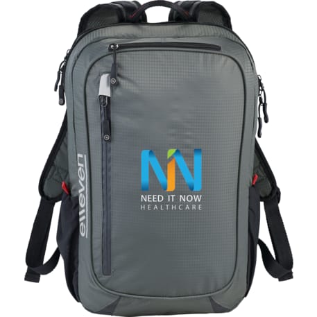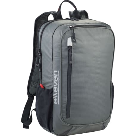 The elleven™ Lunar Lightweight 15" Computer Backpack series is making travel lighter and smarter. Smaller and lighter devices need a bag that is as innovative as the technology inside. The new elleven Lunar backpack includes the same smart organization and functionality you expect in elleven, but in an ultra-light design with weather-resistant nylon and a waterproof front pocket. Coming in at just 1lb, this bag still has the protection you need. The dedicated rear laptop compartment holds up to a 15.6 inch computer, while the main compartment has a pocket for your tablet or iPad®, as well as pockets for your pens, business cards, and cables. Extra organization in the waterproof front pocket and a mesh slash pocket for a water bottle. Lightweight straps are durable and extremely comfortable. Features a padded mesh back with trolley sleeve. Reflective branding adds an additional safety element to keep you visible at night. Free run charges for embroidery up to 10,000 stitches.