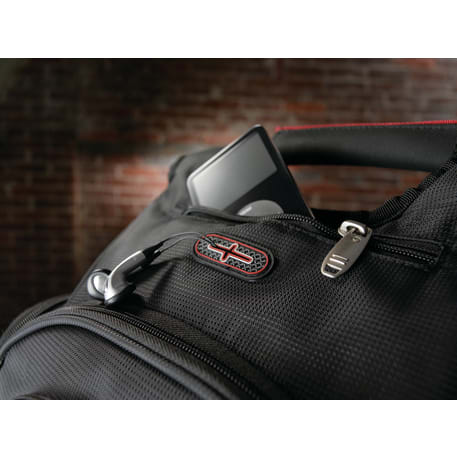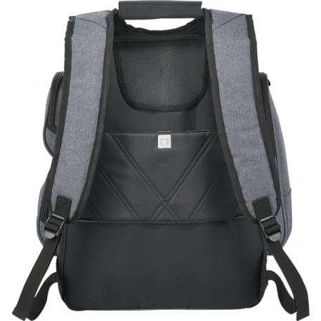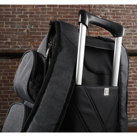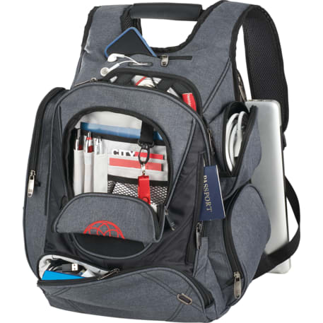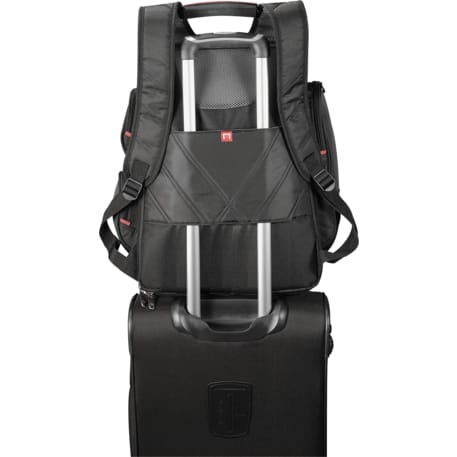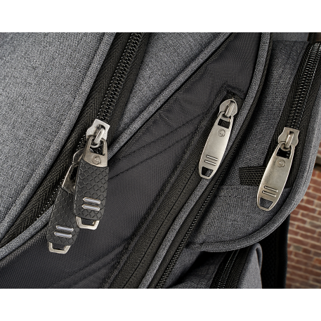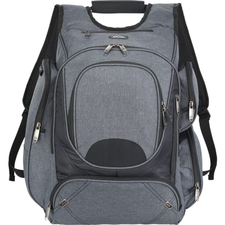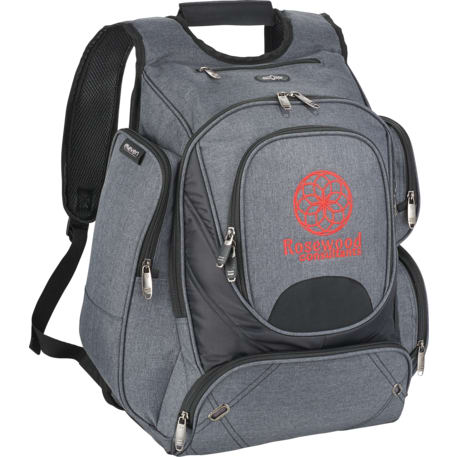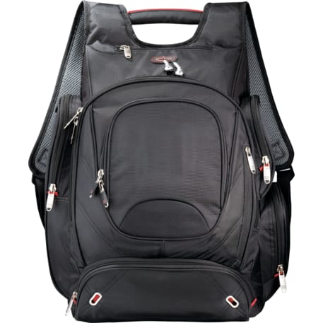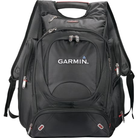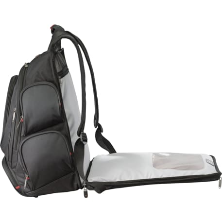 The elleven™ TSA 17" Computer Backpack features an exclusive design that has a designated laptop-only section that unfolds to lay flat on the X-ray belt to increase your speed, convenience and security. Side entry compartment holds up to 1 inch laptop. Main zippered compartment with file divider, interior side pockets and removable techtrap elastic organizer panel. A zippered media pocket accesses ear bud port while a front zippered pocket features deluxe organization and a key fob. Front lower & hidden pockets for valuables. Three side roomy zippered pockets. Yoke-style handle. Padded back and shoulder straps for comfort. Back panel designed to slip over trolley handles. Free run charges for embroidery up to 10,000 stitches. Disclaimer: There may be minor variations in color of the actual product due to the nature of the fabric dyes, weaves and printing.