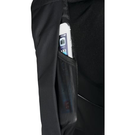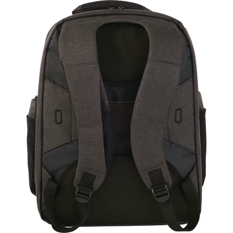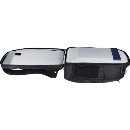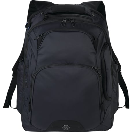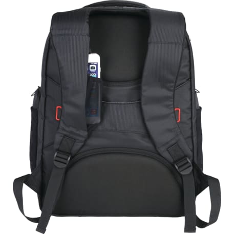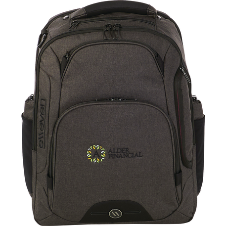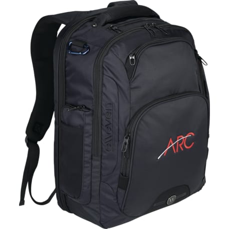 The elleven™ Rutter TSA 17 inch Computer Backpack incorporates executive looks with modern technological and travel needs. Fits most 1 inch laptops in a padded rear computer compartment while the main compartment includes a file divider and dedicated iPad®/tablet pocket. Zippered top nylex-lined pocket fits your iPhone® or other smartphone. Special RFID pocket on the front helps prevent identity theft by shielding your credit card and passport. Additional front pocket includes deluxe organization while the zippered side pockets are perfect for your cables or portable power and the dual mesh side pockets for your water bottle. There is even a hidden mesh pocket on the backpack strap for your phone or ID. Includes a padded neoprene handle, back and adjustable shoulder straps. A trolley handle attachment is integrated into the back panel. Free run charges for embroidery up to 10,000 stitches. Disclaimer: There may be minor variations in color of the actual product.