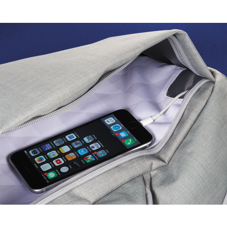 The Zoom® Grid 15" TSA Computer Backpack works to provide you the accessories you need for the technology you use every day. Sleek heathered gray material with gray/silver accents. Signature Zoom lining and cord pass through. Main compartment features a tablet sleeve and a mesh organizer pocket. Padded rear TSA laptop compartment for laptops up to 15.6 inches. Padded back and shoulder straps with trolley sleeve. Zoom branding and accents.