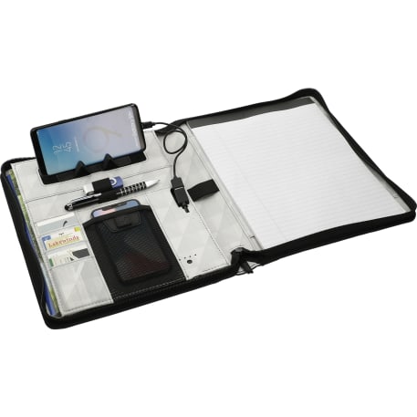 The Zoom 4000 mAh Wireless Charging Zippered Padfolio is packed with power allowing you to charge your smartphone without the cables. Built-in 4000 mAh rechargeable powerbank supports wireless charging at up to 1A for devices including (but not limited to): iPhone 8/8Plus/X/XS/XS Max/XR/11/11 Pro/11 Pro Max *Samsung Galaxy Note5/S6/S6 Edge/S6 Edge+/S7/S7 Edge/S8/S8+/S9/S9+/Note 9 * Google Nexus 5/6/7 * HTC Droid DNA, 8X * LG G3/G4, Lucid 2/3 * Nokia Lumia 920/930 *. Front pocket. Interior document pocket, bullt-in phone stand, mesh smartphone pocket, elastic pen loops. Zippered closure. Includes writing pad with 30 sheets of white lined paper. 1 piece premium gift box.
