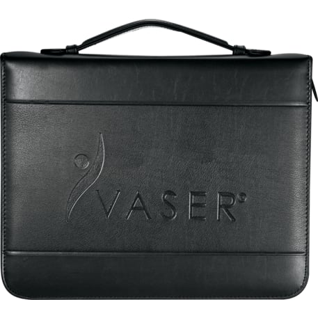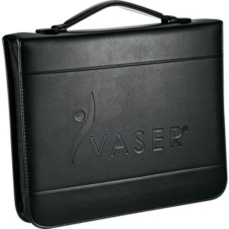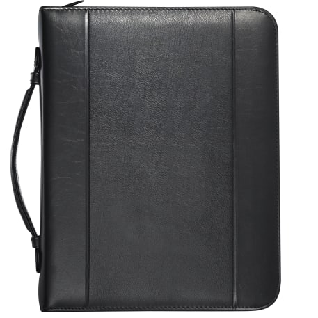 Zippered closure. Elastic pen loop. 2 document pockets. 2 business card holders. Interior organizer with 1" three-ring binder. Clear calendar management pocket that doubles as a page marker. Comes with undated calendar insert. Includes 8.5" x 11" writing pad. Refills available at leedsworldrefill. Refill item # 9091-01RF.