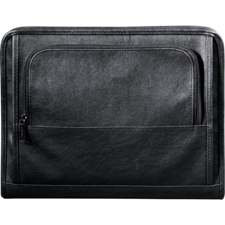 Zippered closure. Removable 1" three-ring binder. Deluxe front and interior organizers. Includes 8.5" x 11" writing pad. Refills available at leedsworldrefill. Refill item number 9091-0. Pen not included.