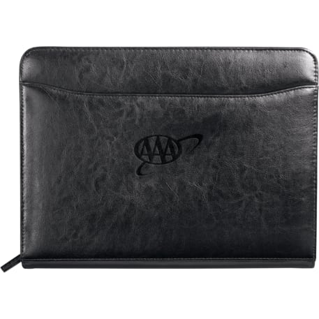Zippered closure. Interior organizer with gusseted file pocket, business card pockets and calculator pocket. Front pocket. Pen loop. Includes 8.5" x 11" writing pad. Refills available at leedsworldrefill. Refill item number: 9091-01. Pen not included.