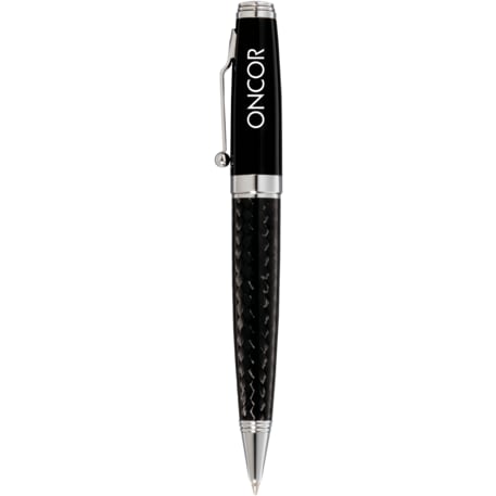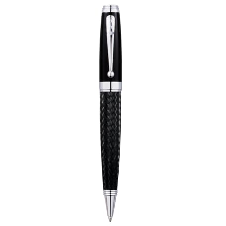 High gloss black enamel upper barrel with carbon fiber detailing in lower barrel. Highlighted with chrome accents. Twist action mechanism. Pen includes premium black ink cartridge. 1.0mm pen tip. Laser finish is shiny chrome.