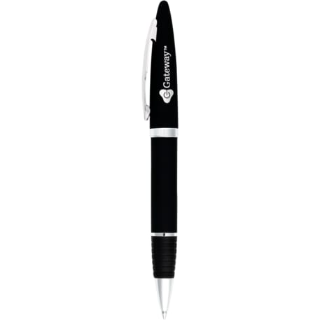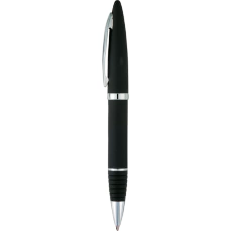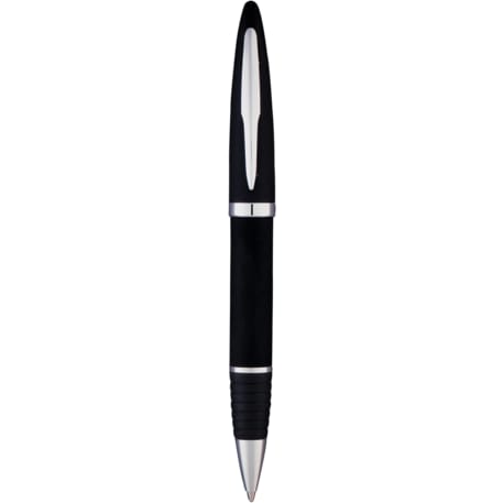 Spray rubber coat finish with bold chrome contrast accents and rubber grip. Twist action mechanism. Pen includes premium black ballpoint ink cartridge. 1.0mm pen tip. Laser finish on black is shiny chrome. Laser not available on Navy.