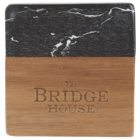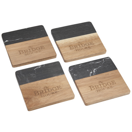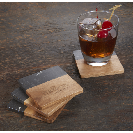 This on trend coaster set is crafted from marble and acacia wood. The coasters are square with rounded corners. These chic coasters are perfect for the home or office. Decoration on all four coasters. Due to the natural material variations in the marble pattern and laser imprint will occur.