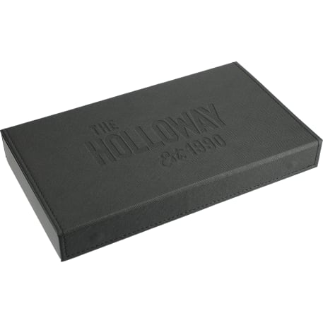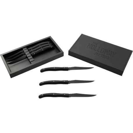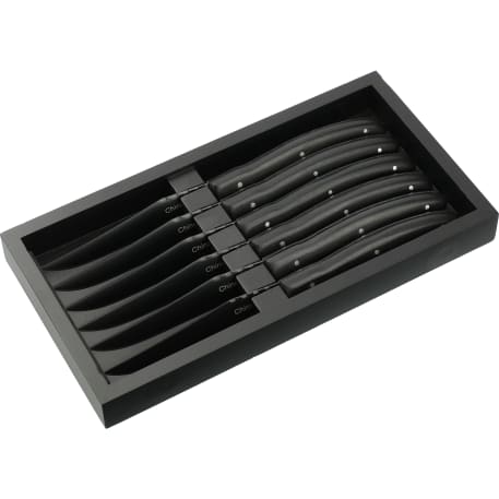 The Modena Black Knite Set is a traditional favorite that includes a six-piece knife set in a wood case. The case is convenient for both storage and presentation. All of the knives have stainless steel blades with black pakka wood handles. Each knife measures 9" x 0.75" x 0.5".