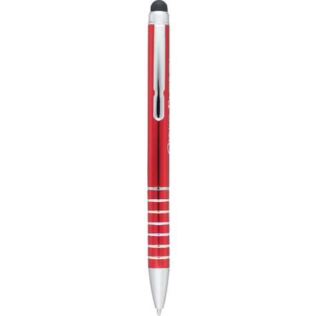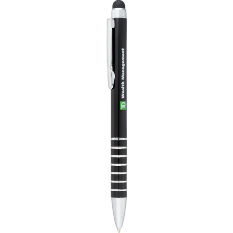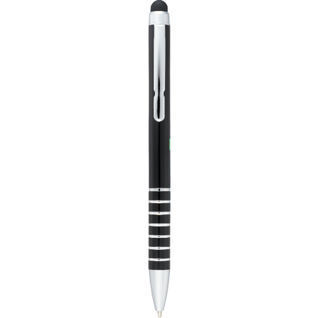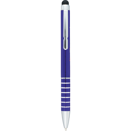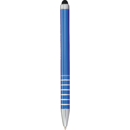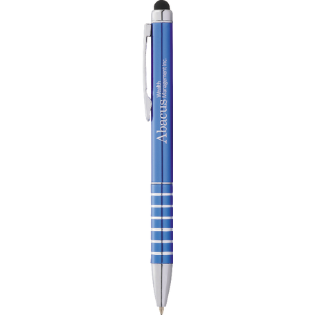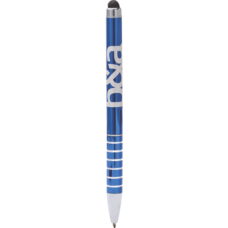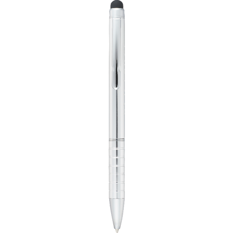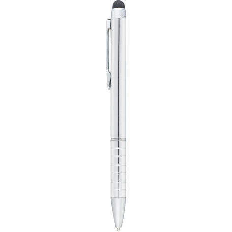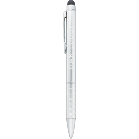 The Preston Dual Ballpoint Stylus combines a classic ballpoint silhouette with the added stylus function. Grip is artfully textured with chrome rings. Retractable twist action mechanism with standard blue ballpoint ink cartridge and 1.0mm pen tip. Laser 360 is available on this style. Laser finish is matte-white.