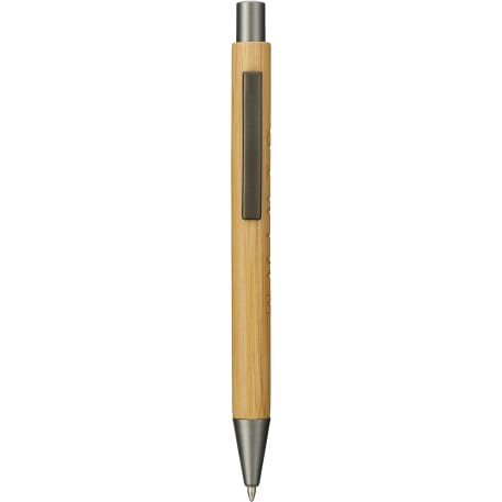 The Bamboo Ballpoint features a 100% bamboo barrel with gunmetal accents. Equipped with ultra-smooth, quick dry semi-gel black ink cartridge. Click action mechanism. Pen tip is 1 mm. Writing length is 800m. Laser finish is light to dark brown wood burned appearance.