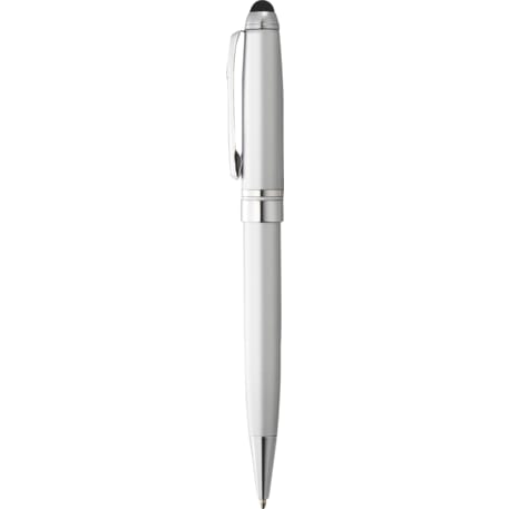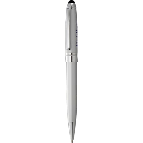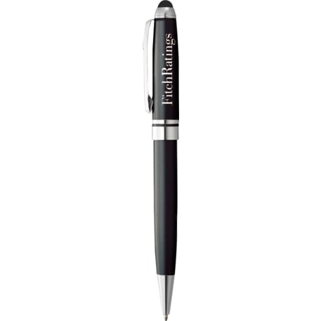 Classic design meets the new corporate needs in this dual ballpoint stylus pen. Soft rubber stylus tip is integrated into the end cap of pen and eliminates fingerprints and smudges on your device. Compatible with any capacitive touchscreen device including iPhone, iPad, Blackberry, and Android OS Tablets or Smartphones. Also ideal for any public touchscreen uses such as ATM or retail payment pads. 1.0mm pen tip and black ink. Laser finish is shiny chrome.