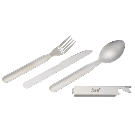 The 3 Piece Metal Cutlery to Go is the perfect set for any outdoor adventure. It features a knife, spoon, fork, and a metal holder that doubles as a bottle opener.