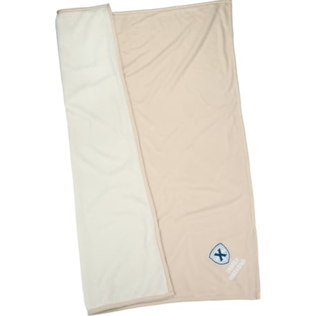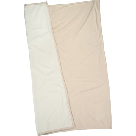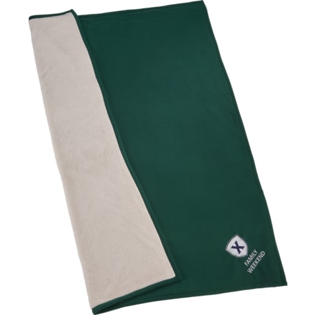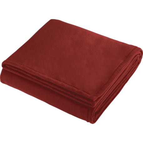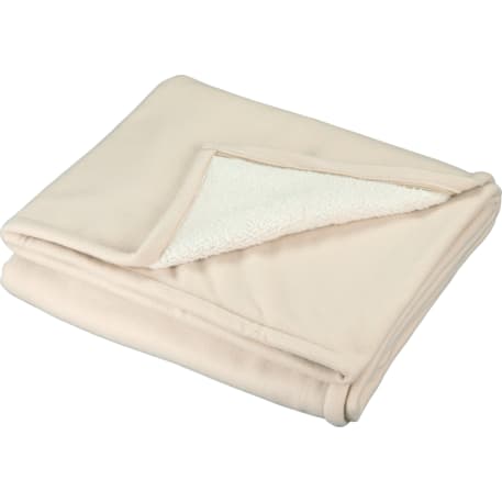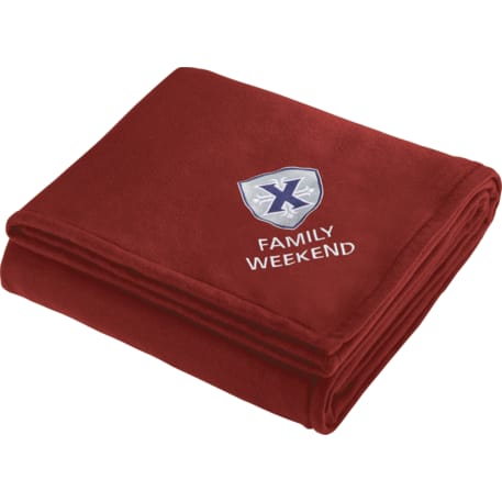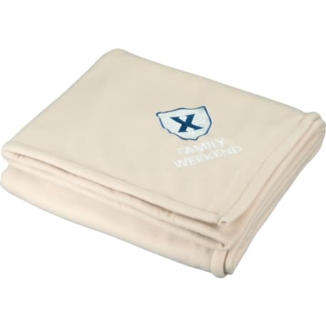 Polar fleece on one side and soft sherpa on the other. Snuggling up in this blanket will keep you extra warm on the chilliest winter nights. Free run charges for embroidery up to 10,000 stitches. The open dimensions are 60" x 50" and folded dimensions are 14.5" x 12". This blanket is spot clean only.