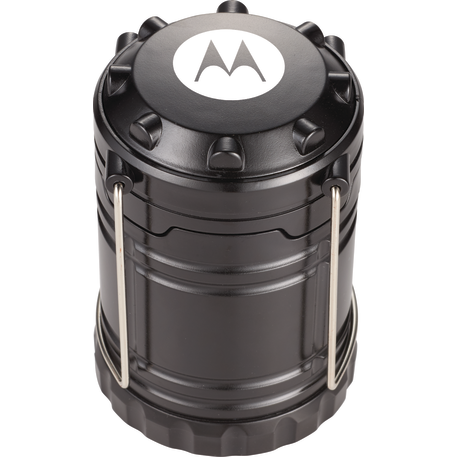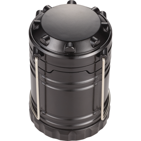 LED lantern turns on by sliding open and turns off by closing. Opens to 7.25in. fully extended. Features metal carry and hanging handle. Includes 3 AAA batteries.