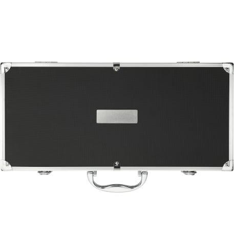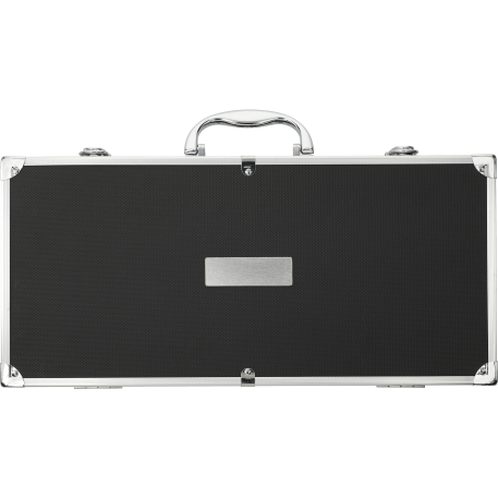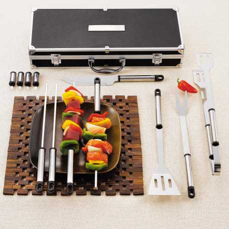 This 13-piece BBQ set includes everything needed to be king or queen of the backyard grill - spatula, tongs, knife, fork, four skewers, and four corn holders, all in an aluminum accented case. Handles are plastic with stainless steel grip to prevent heat transfer. For the skewers this allows you to hold the handles and have full control basting food and perfecting the amount of charring you want. Do not expose the handles to direct heat or use in broiler.