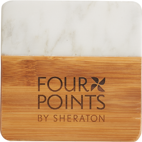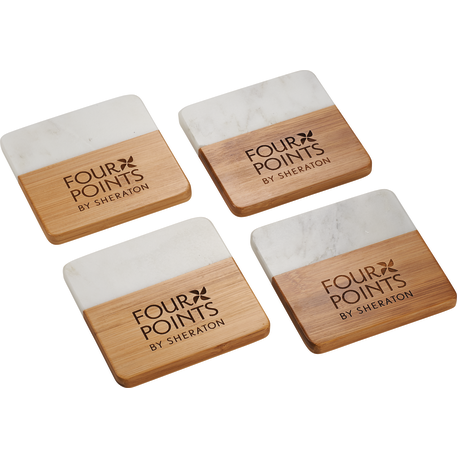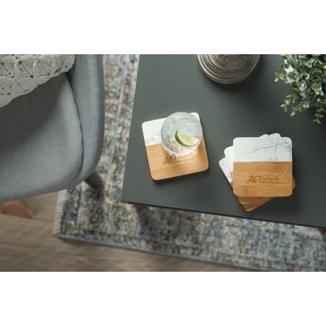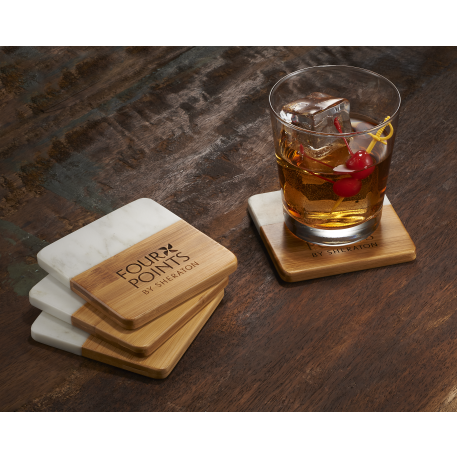 Each item in the four-piece Marble and Bamboo Coaster Set is square with rounded corners, perfect for your coffee table, office desk, or nightstand. Natural variations in the marble give each piece a unique, hand-crafted look, making these coasters truly one-of-a-kind. Due to the nature of the bamboo material, variations in laser imprinting quality may occur.