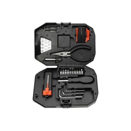 The Built2Work Flashlight 22 Piece Tool Set features a flashlight built into the toolbox that also doubles as a headlamp with straps included, box cutter, Allen wrench set, socket set, pliers, 1M tape measurer a connector, and mini screwdrivers. 3 AAA Batteries included.