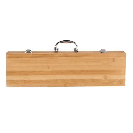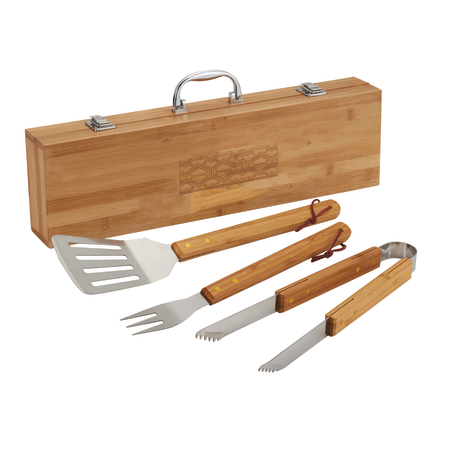 Grill out in style with this 3-piece premium BBQ set. Bamboo case is both functional and decorative. Tools are full size, durable stainless steel with bamboo handles. Due to the nature of the bamboo material, variations in laser imprinting quality may occur.