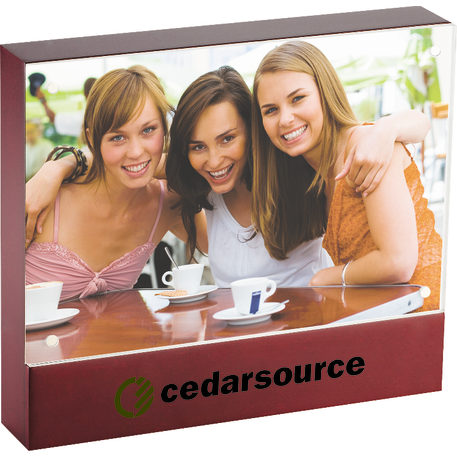 Wooden appearance base photo frame holds 4" x 6" with a clear acrylic cover that is held into place with magnets. This quality frame is over 1" thick and will add a nice touch to the office or home.