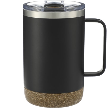 The Valhalla Copper Vacuum Insulated Camp Mug 14oz combines a classic camp mug design with a stylish and functional skid-proof synthetic cork base. Its durable double-wall stainless steel vacuum construction with copper insulation, allows your beverage to stay cold for up to 24 hours and at hot for up to 8 hours. The construction also prevents condensation on the outside of the piece. On-trend, durable powder coating. Its transparent push on lid features a slide closure. 14oz. ***Cork color on lid slider & bottom base varies because of its natural feature.