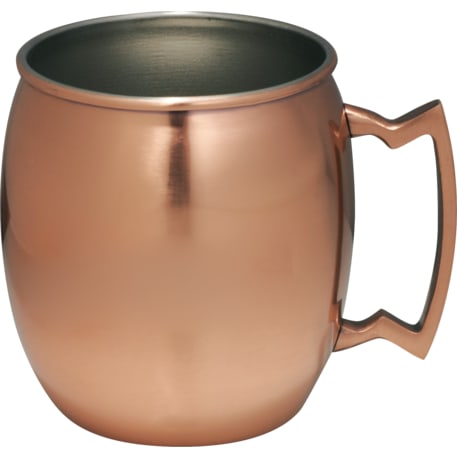 Style inspired by the popular Moscow Mule cocktail. Stainless steel construction with copper plating. Gift box features a robust history of the cocktail and a recipe card is included. 16oz.