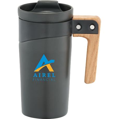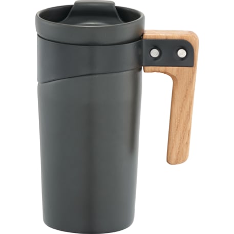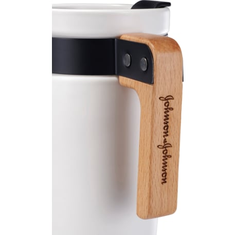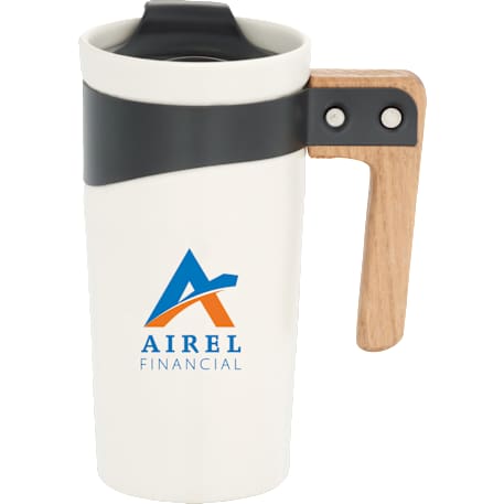 A must-have ceramic tumbler. Matte finish body and natural wooden handle are combined by the black coated stainless steel band. Push-on, slide lock lid included. Up to 3 logo decoration spots are available. Leed's Exclusive. 16 oz.
