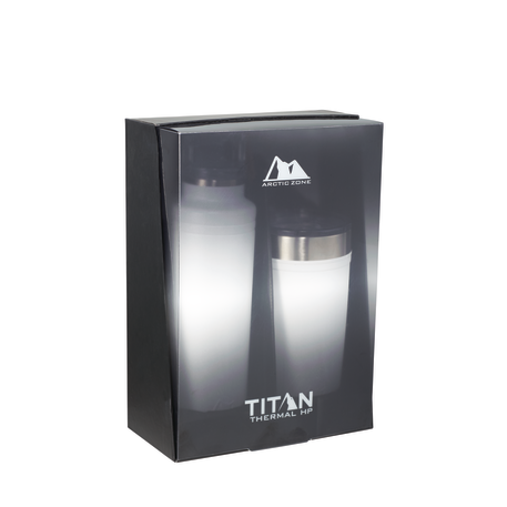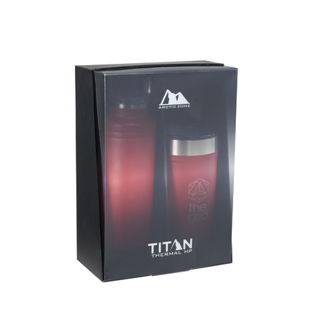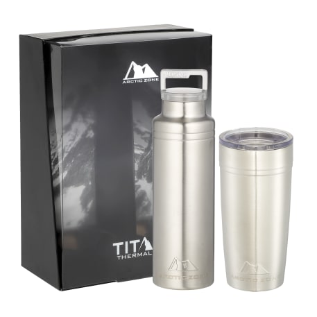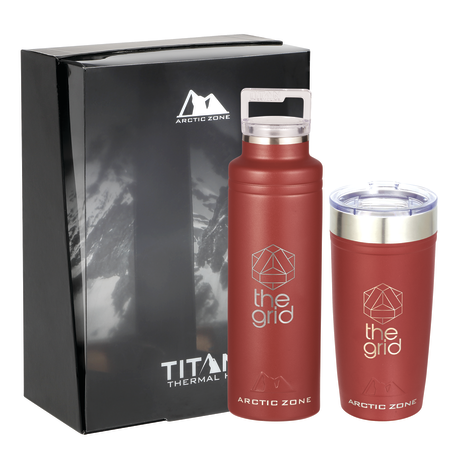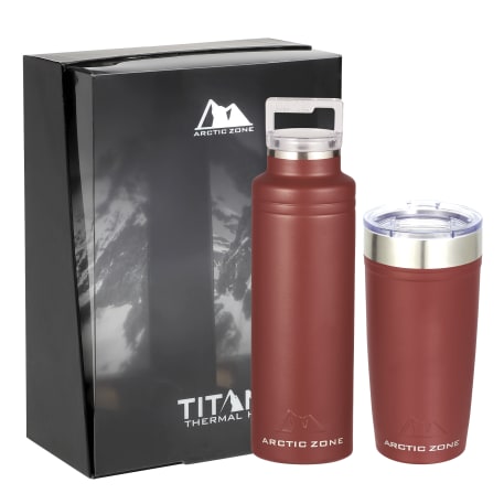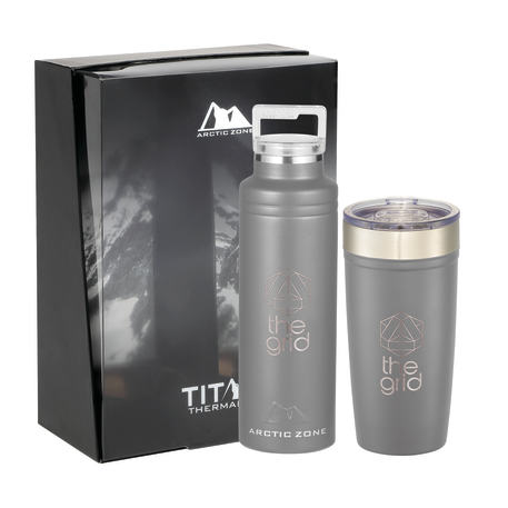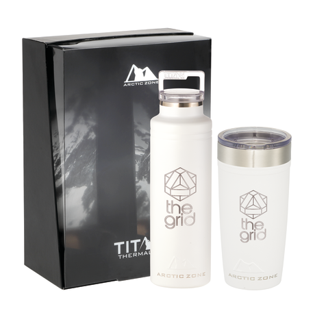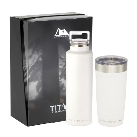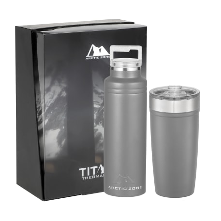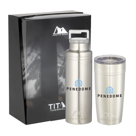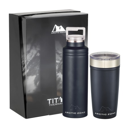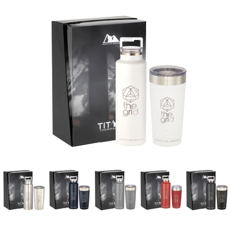 Do not miss out on one of the best gift sets of the year. Includes the Arctic Zone® bottle 1626-22 20oz and the Arctic Zone® 20oz Tumbler 1625-66. Durable, double-wall 18/18 stainless steel vacuum construction with copper insulation, which allows your beverage to stay cold for 24 hours and hot for at least 8 hours. The construction also prevents condensation on the outside of the piece. Leed's Exclusive. 20oz. Gift Box is not decorated. There might be a tiny color variance across the components in a set. “For additional protection, all Drinkware pieces will be individually polybagged and inserted in the gift box.”