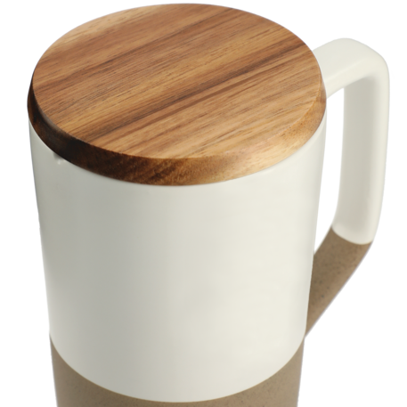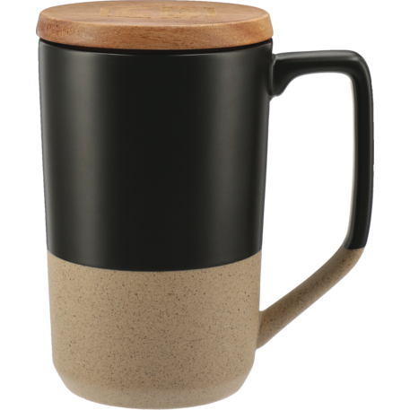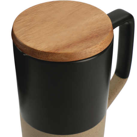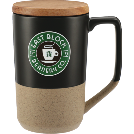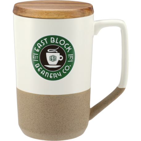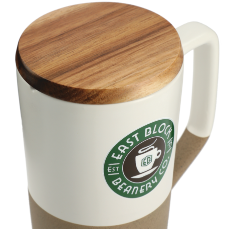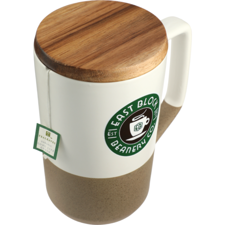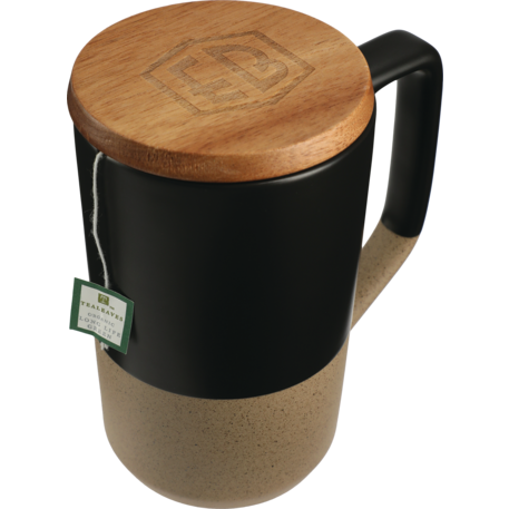 Cozy ceramic mug with vintage finish on the body. Features an innovative groove design on the top for holding tea bags. And perfect to drink coffee with this mug. Wood, push-on lid, spill resistant. Choose between color imprinting or our new cutting edge, dishwasher safe, laser decorating method. Leed's Exclusive. 16oz. microwave safe.