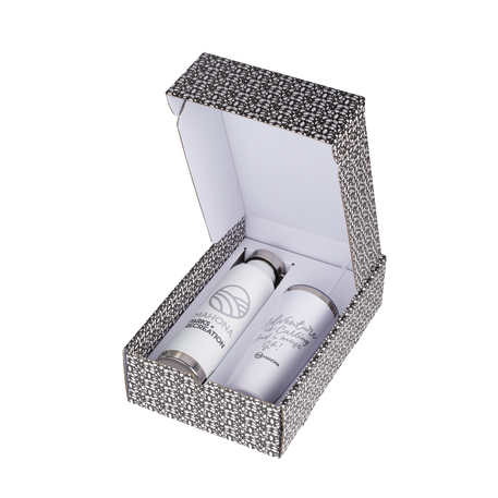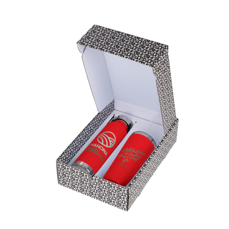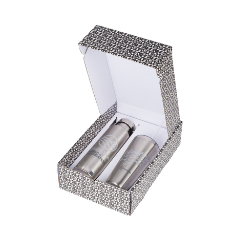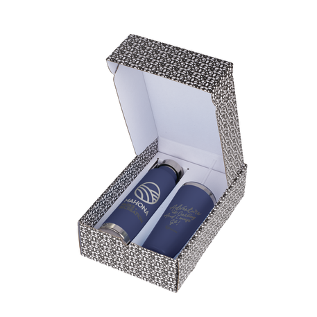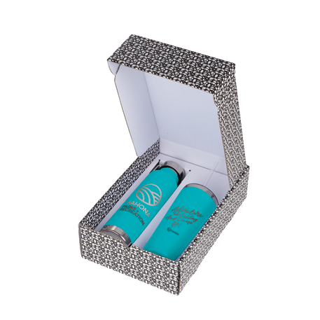 Great choice! Includes the Thor bottle 1625-85 22oz and Thor Tumbler 1626-50 22oz. Durable, double-wall stainless steel vacuum construction with copper insulation, which allows your cold beverage to stay cold for 24 hours and hot for at least 6 hours. The construction also prevents condensation on the outside of the piece. Leed's Exclusive. Gift box is not decorated. There might be a tiny color variance across the components in a set. “For additional protection, all Drinkware pieces will be individually polybagged and inserted in the gift box.”