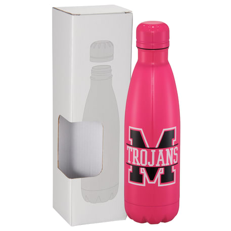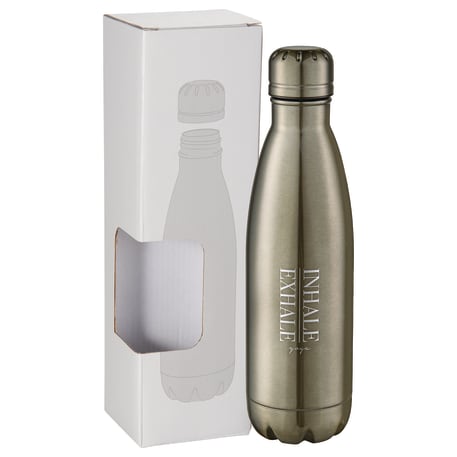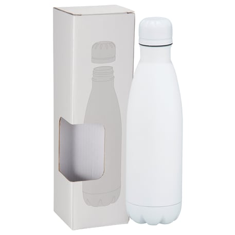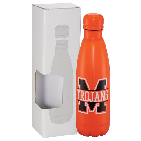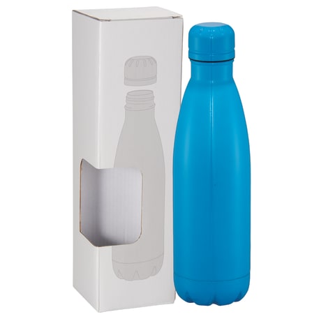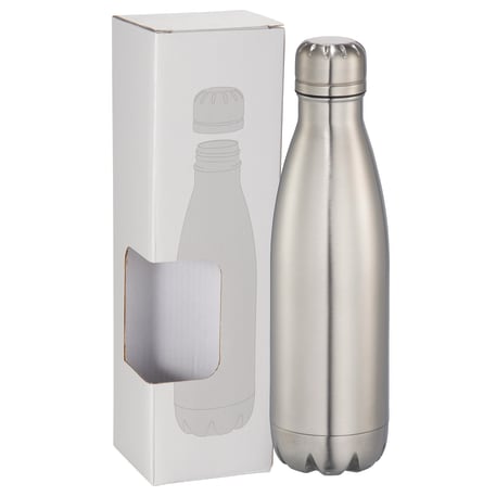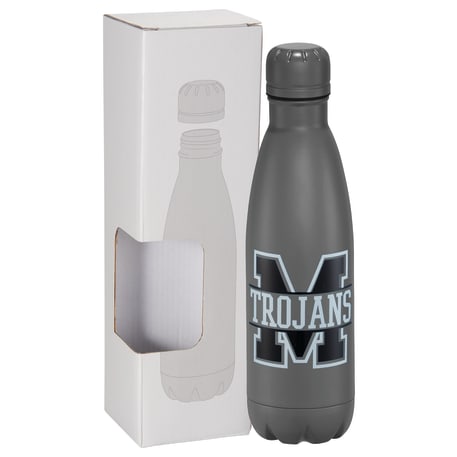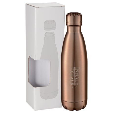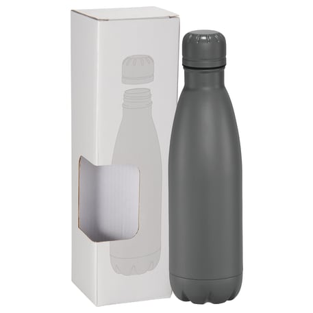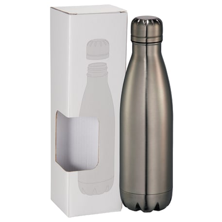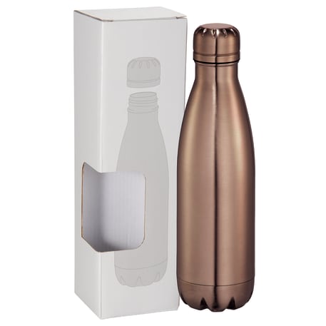 Bottle is double wall 18/8 grade stainless steel with vacuum insulation. Inner wall is plated with copper for ultimate conductivity to keep drinks hot for 12 hours and cold for 48 hours. 17oz. Drinkware is 1624-74. “For additional protection, all Drinkware pieces will be individually polybagged and inserted in the gift box.”