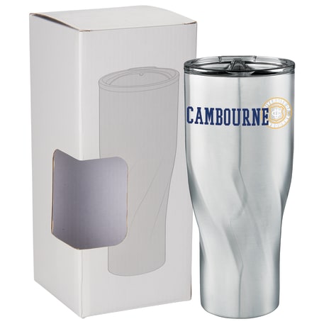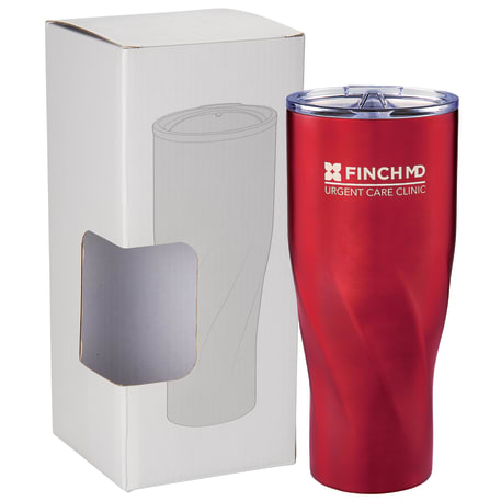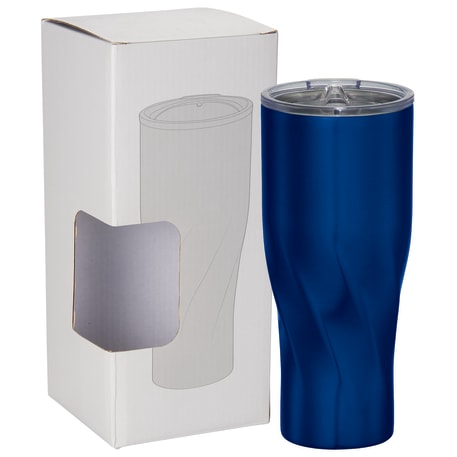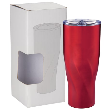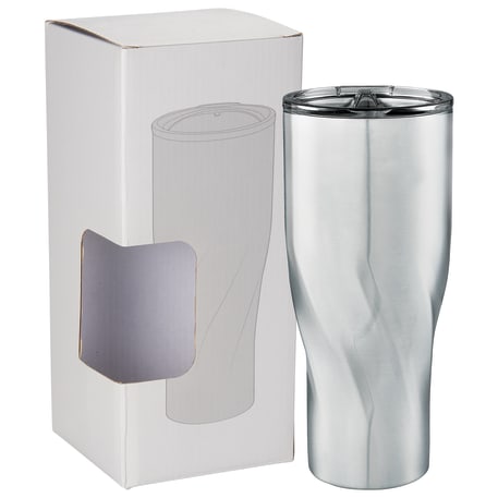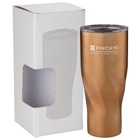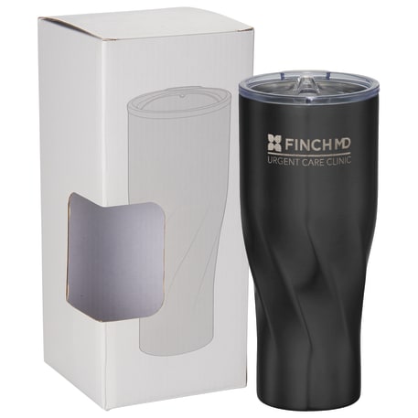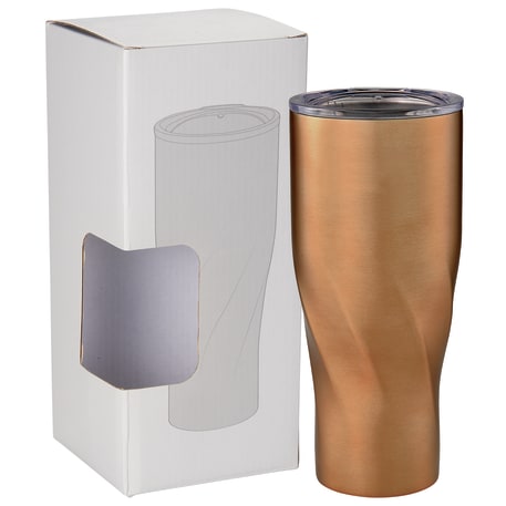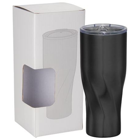 Do not miss the most trendy tumbler of the year. Durable, double-wall stainless steel vacuum construction with copper insulation, which allows your beverage to stay cold for 24 hours and at least 8 hours for hot beverages. The construction also prevents condensation on the outside of the tumbler. Push-on two piece lid with Tritan™ swivel anti-spill closure, pinch the 2 axis joints slightly to remove the top part of the lid for easy cleaning. Wide opening for comfortable filling and pouring. Design features the spinning, geometric bottom. Leed's Exclusive. 30oz. Drinkware is 1625-09. “For additional protection, all Drinkware pieces will be individually polybagged and inserted in the gift box.”