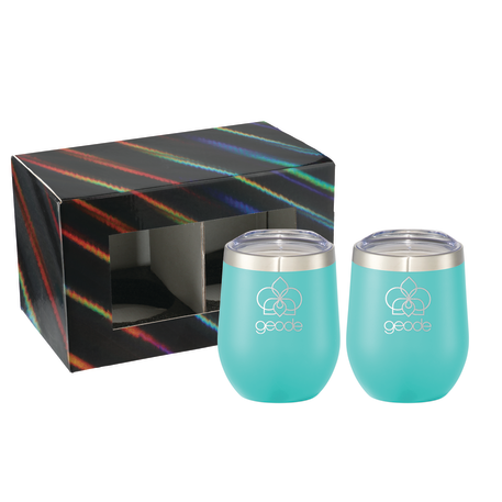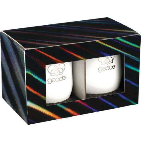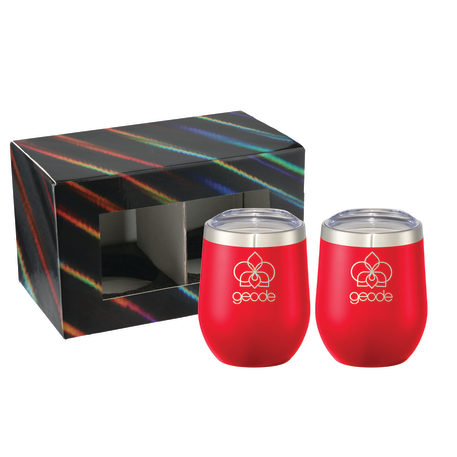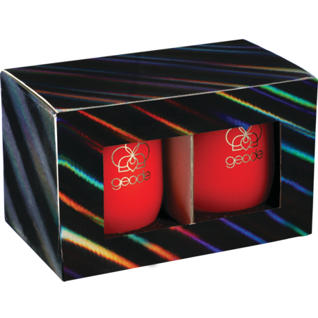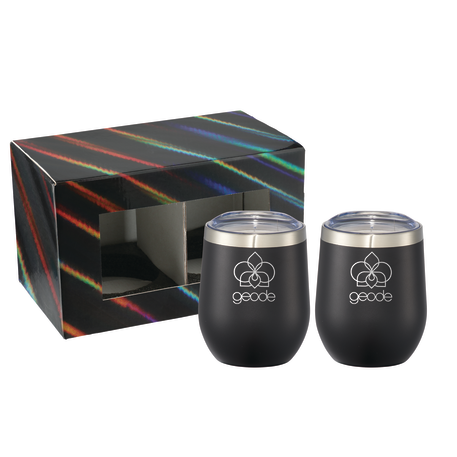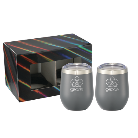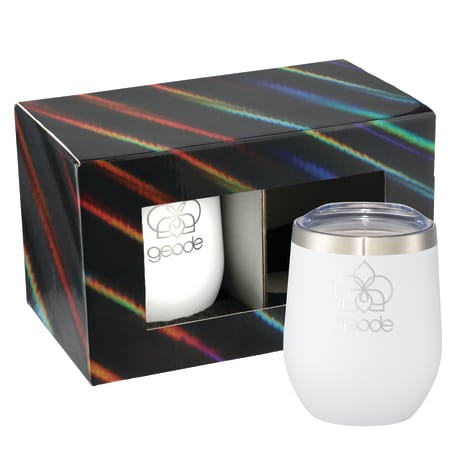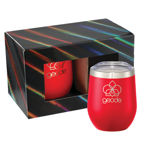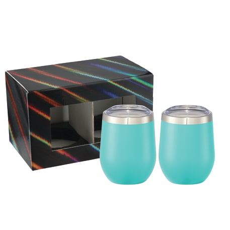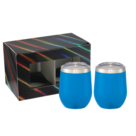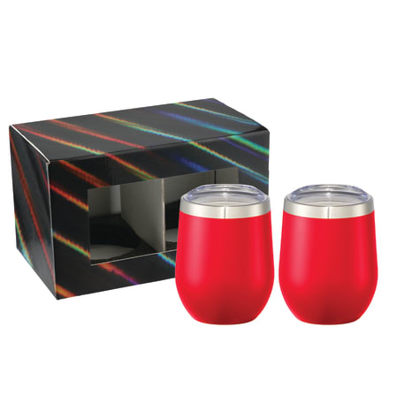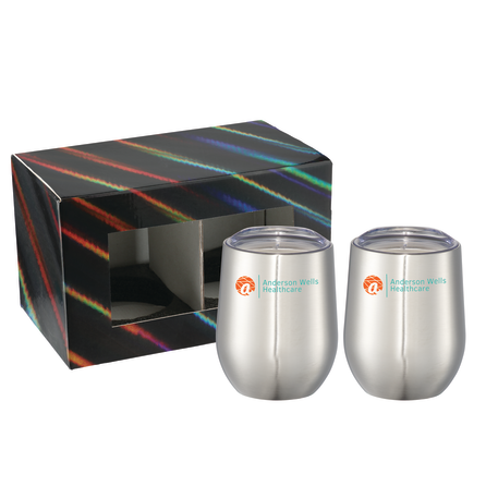 Includes 2 Corzo cups 1625-53. Durable, double-wall stainless steel vacuum construction with copper insulation, which allows your beverage to stay cold for 24 hours and hot for at least 6 hours. The construction also prevents condensation on the outside of the piece. Leed's Exclusive 12oz. The product comes in a holographic gift box as shown in the image. Gift Box is not decorated.