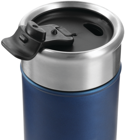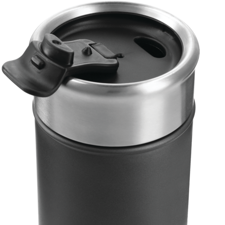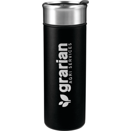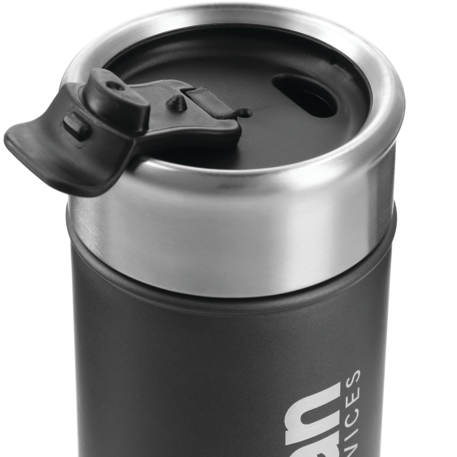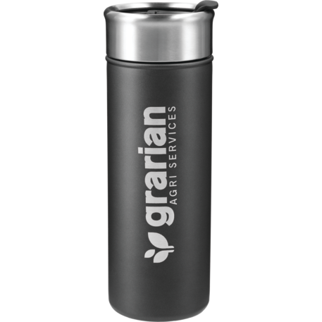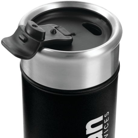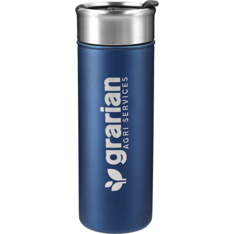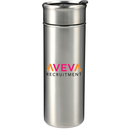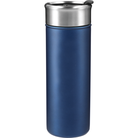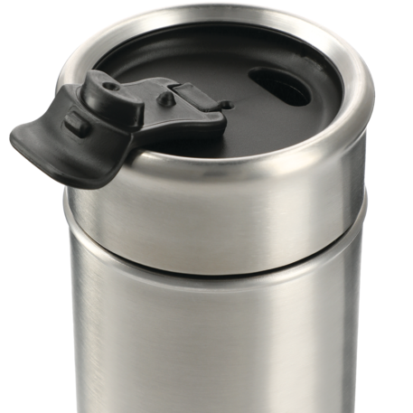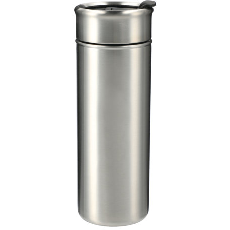 Double-wall, copper vacuum insulated, stainless steel construction. Keeps drinks hot for 8 hours and cold for 24 hours. Stainless, screw-on lid with flap-seal closure. Fits most standard car cup holders. 18oz.