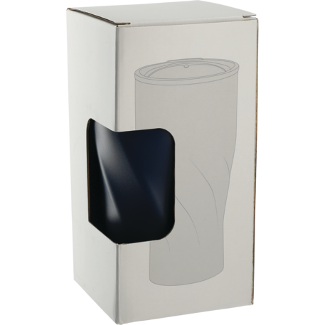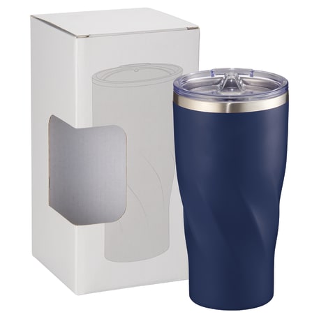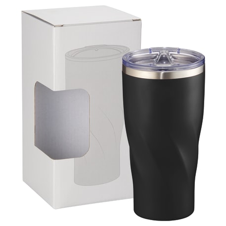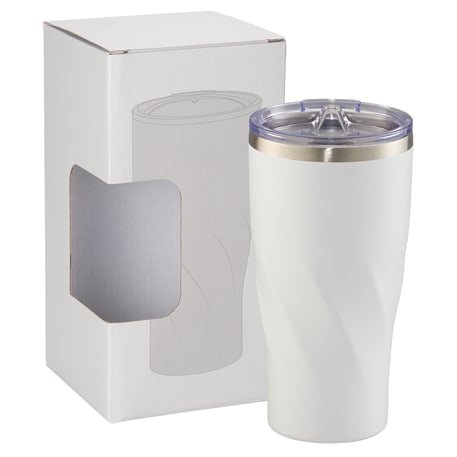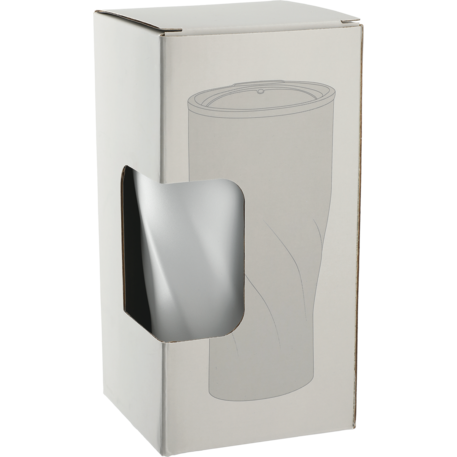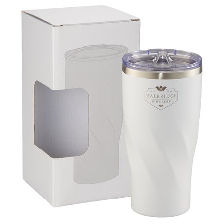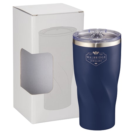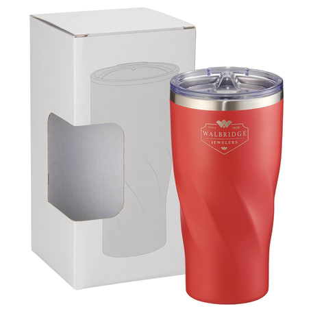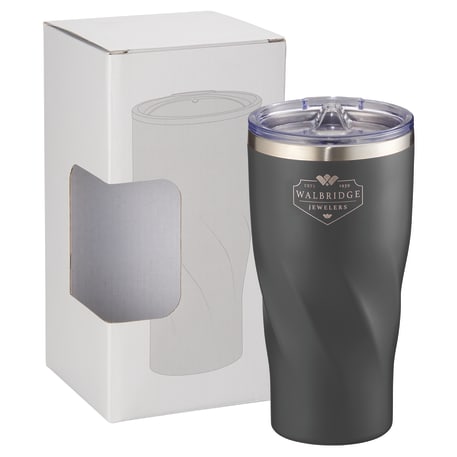 Do not miss the most trendy tumbler of the year. Durable, powder coating, double-wall stainless steel vacuum construction with copper insulation, which allows your beverage to stay cold for 24 hours and at least 8 hours for hot beverages. The construction also prevents condensation on the outside of the tumbler. Push-on two piece lid with Tritan™ swivel closure, pinch the 2 axis joints slightly to remove the top part of the lid for easy cleaning. Wide opening for comfortable filling and pouring. Design features the spinning, geometric bottom. Leed's Exclusive. 20oz. Laser engraving silver Drinkware will result in a subtle, tone on tone decoration.