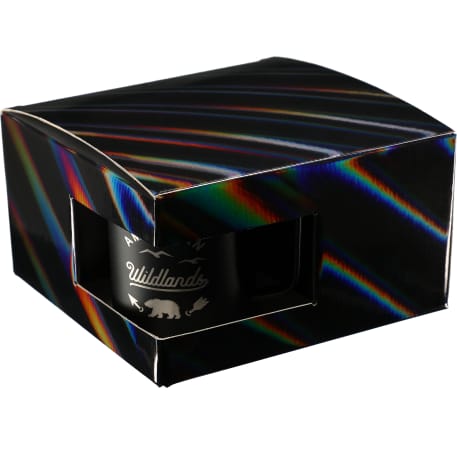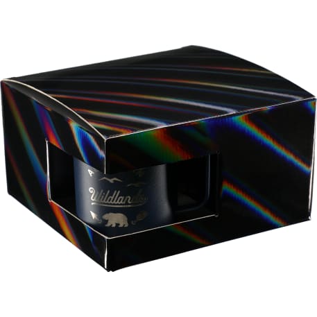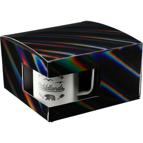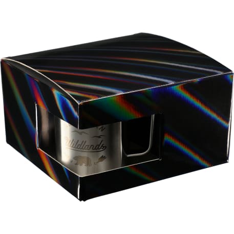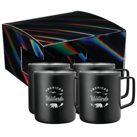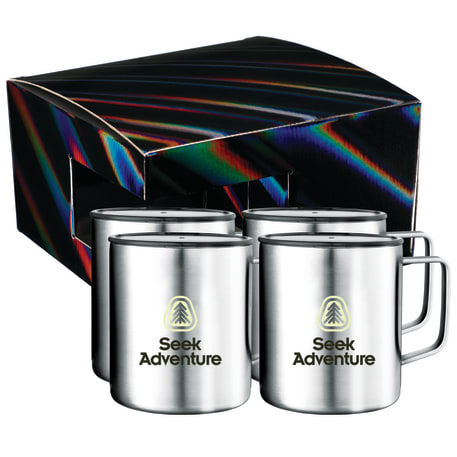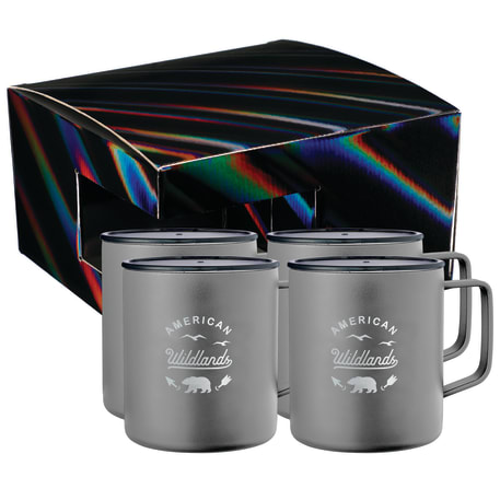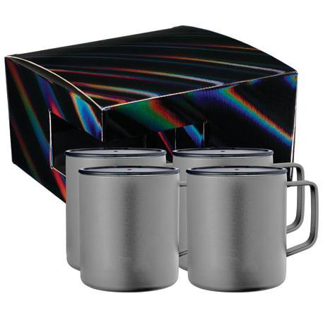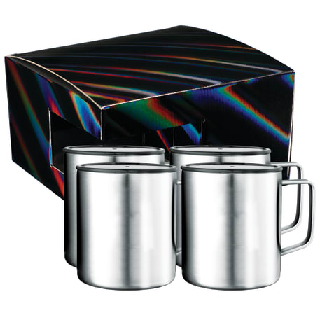 Includes 4 Rover Camp Mug 1625-76. Durable, double-wall stainless steel vacuum construction with copper insulation, which allows your beverage to stay cold for 24 hours and hot for at least 6 hours. The construction also prevents condensation on the outside of the piece. On-trend, durable powder coating. Leed's Exclusive. 14oz. The product comes in a holographic gift box as shown in the image.
