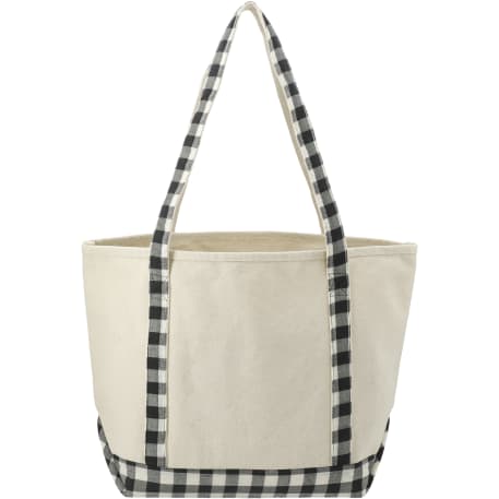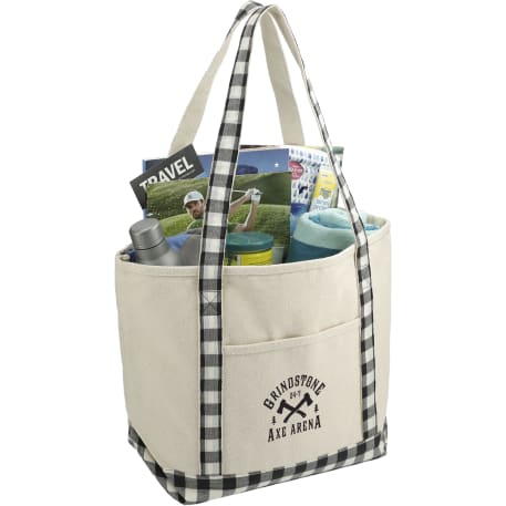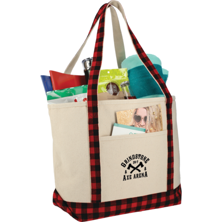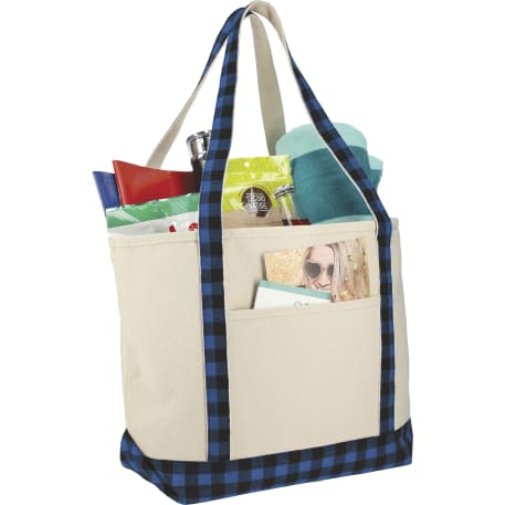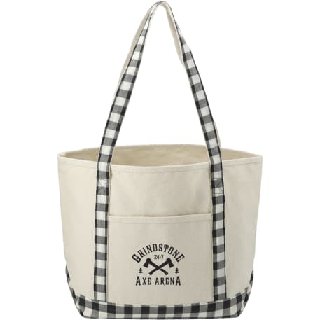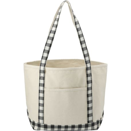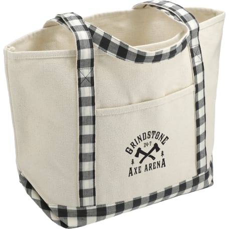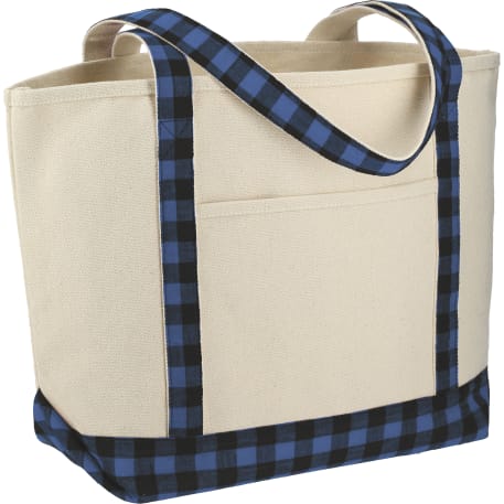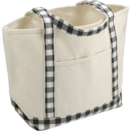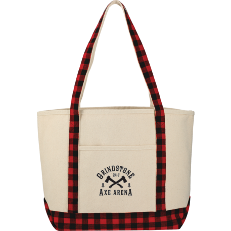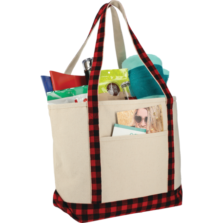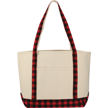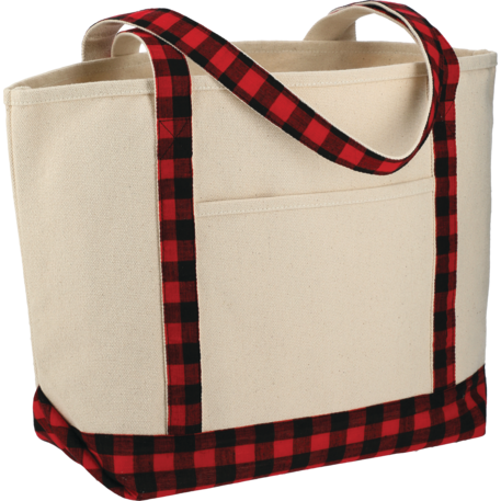 This classic boat tote silhouette now comes with trendy buffalo plaid accents. It features a roomy, open main compartment, natural cotton canvas main material, and trendy buffalo plaid accents.