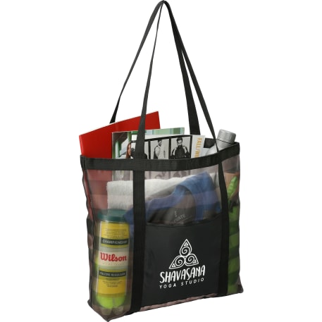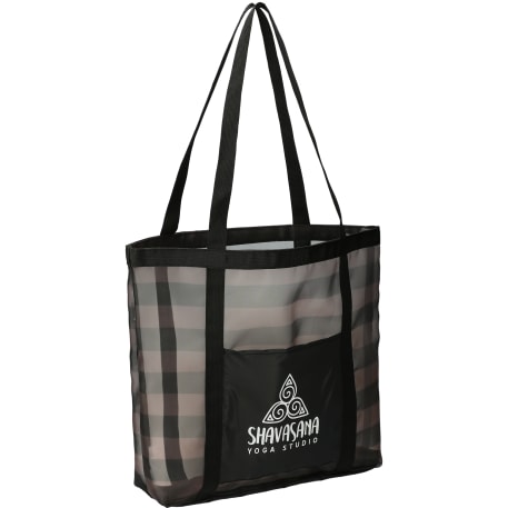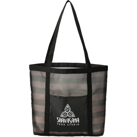 The Two-Tone Mesh Shopper Tote features an open main compartment, slash front pocket, and trendy two-tone stripes.