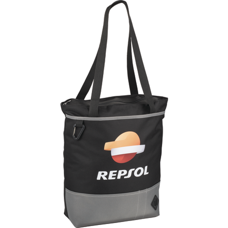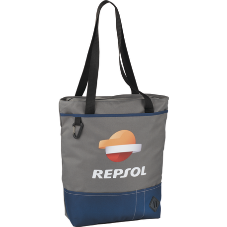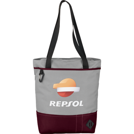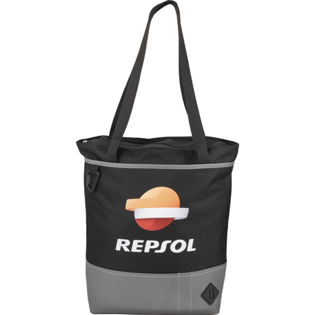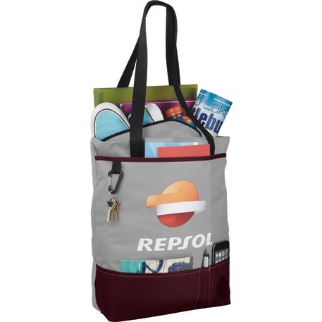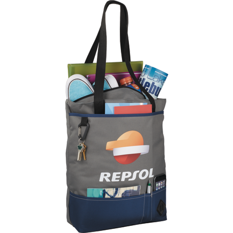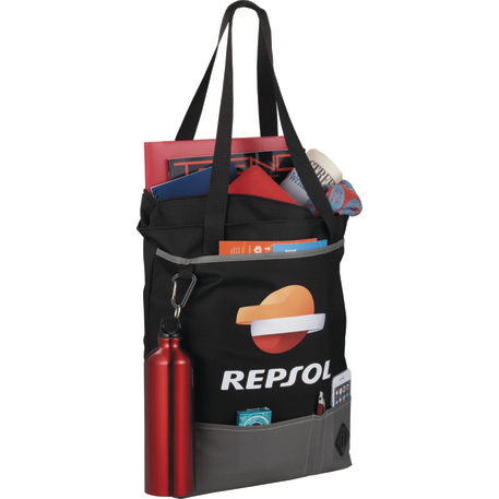 This is the ideal trendy convention tote. Zippered main compartment. Hook and loop closure front slash pocket. Phone and organizational pockets running along the base of the tote including a pen slot. D-ring and added corner detail to hang keys or water bottle. 14.5" handle drop height. Disclaimer: There may be minor variations in color of the actual product due to the nature of the fabric dyes, weaves and printing.