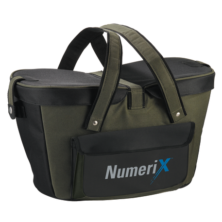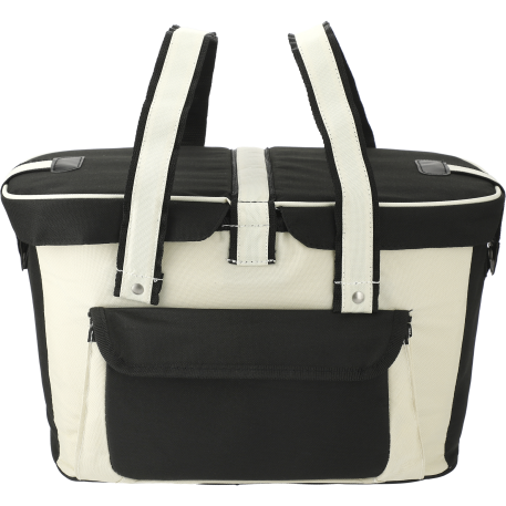 Main compartment features unique picnic basket design with dual snap closures. Holds up to 24 cans. External accessories pockets. 6" handle drop height. Insulated PEVA lining.