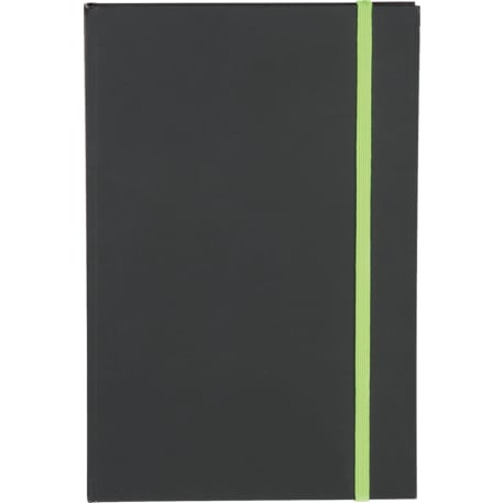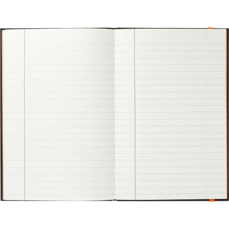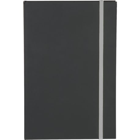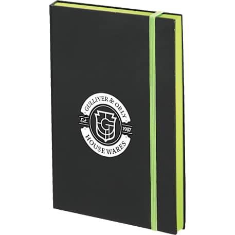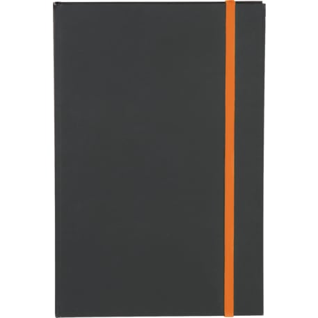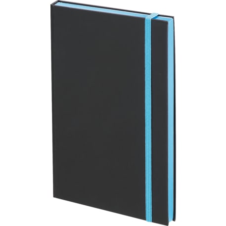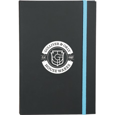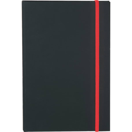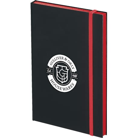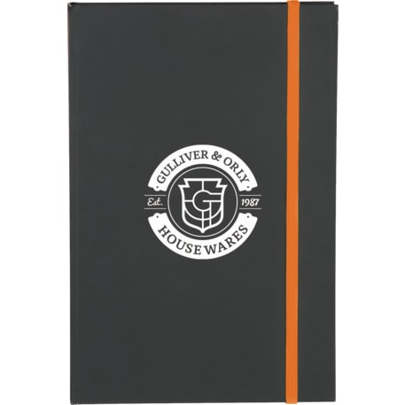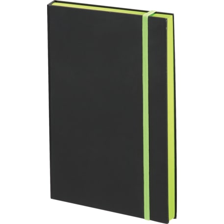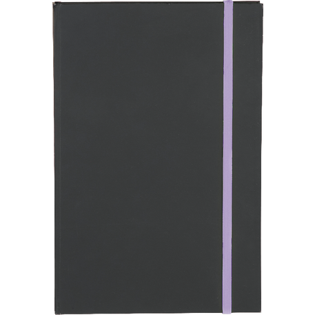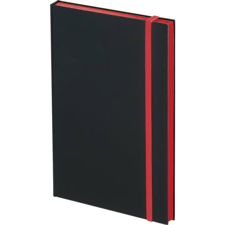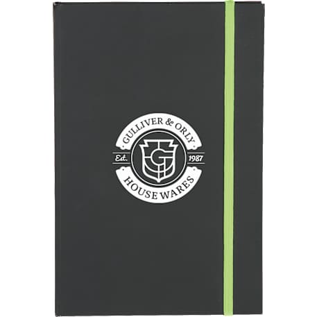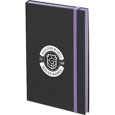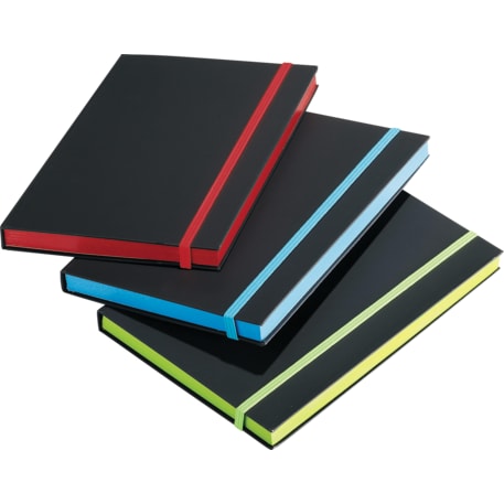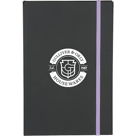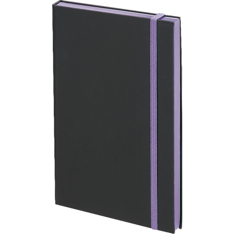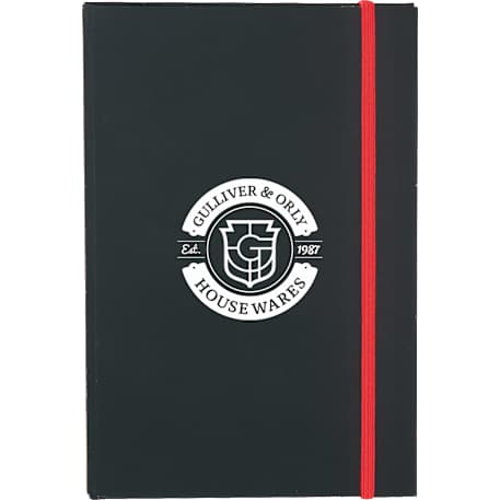 Hard cover, bound journal. 96 sheets of cream lined paper features bright colored edges. Corresponding color elastic closure. Soft matte black cover highlights the most subtle or colorful logos. Please note deboss imprint has low contrast due to this item's cover material.