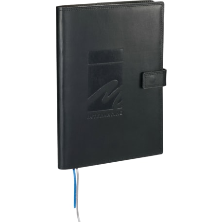 The 7" x 10" Uptown Refillable Leather JournalBook® features a genuine leather soft cover with a double stitched border. Includes elastic pen loop, magnetic tab closure, blue and silver ribbon page markers, and a business card slot. 128 page white lined refill. Pen is not included.