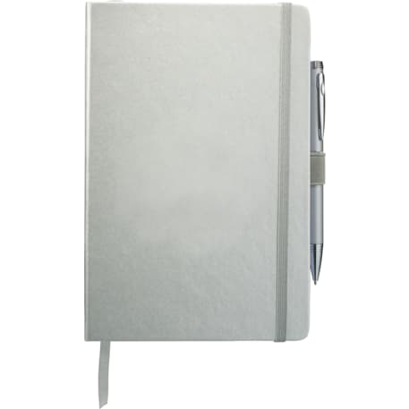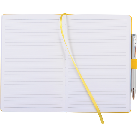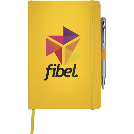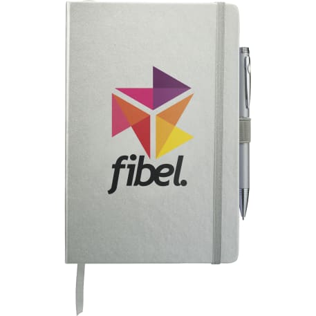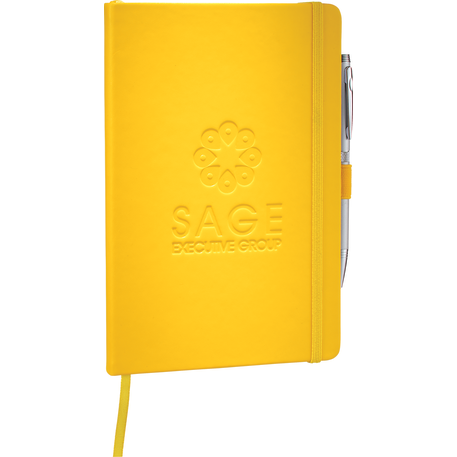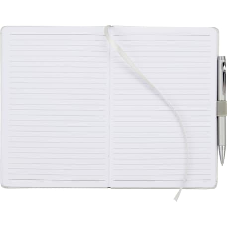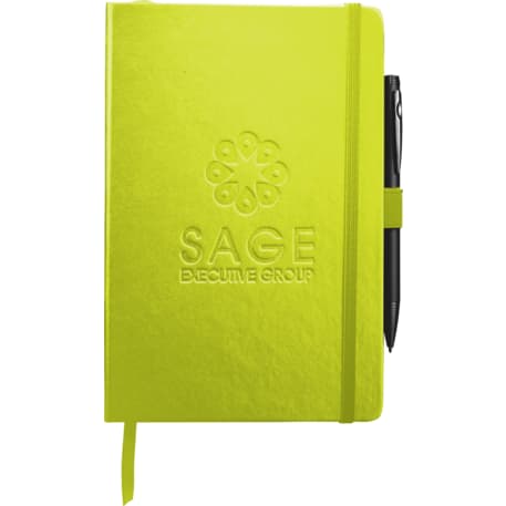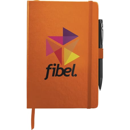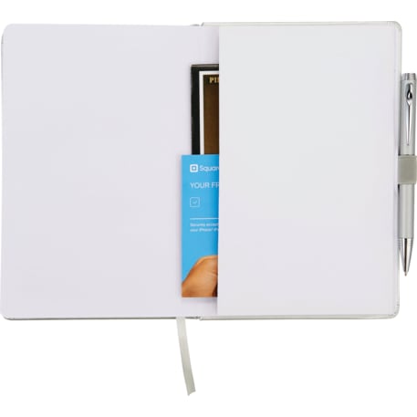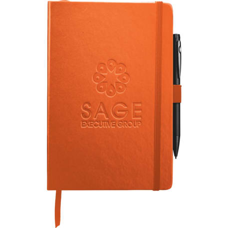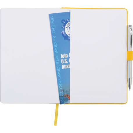 The 5.5" x 8.5" FSC Mix Nova Bound JournalBook® features a faux leather like, hard cover with built-in elastic closure, ribbon page marker, and expandable accordion pocket. Includes 96 sheets of lined white paper. Pen is not included.