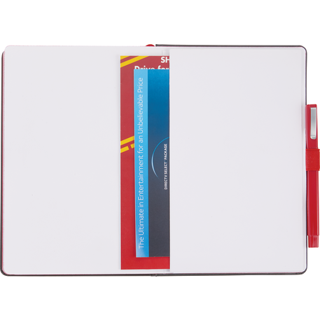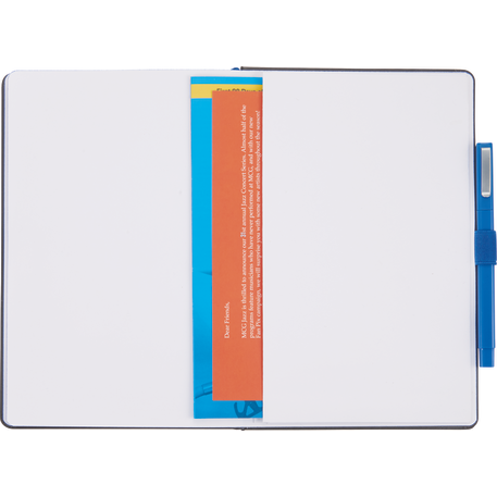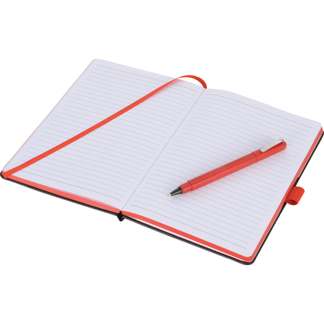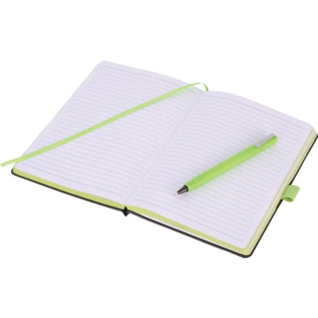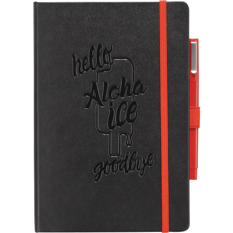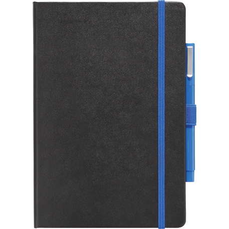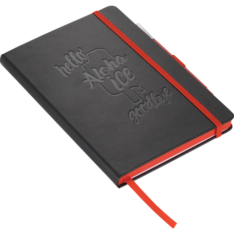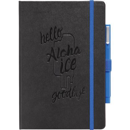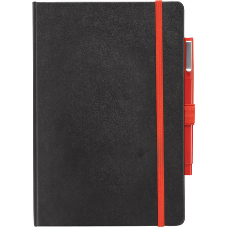 Faux leather like, hard cover bound journal with built in elastic closure. Color accent painted edge paper, elastic pen loop and ribbon page marker. Back document pocket. Includes 96 sheets of white lined paper. Pen is not included.