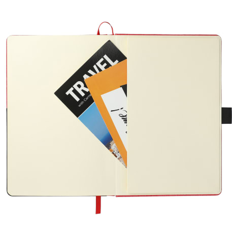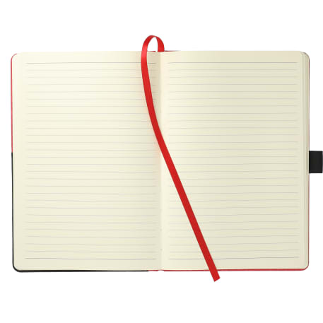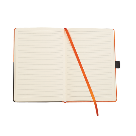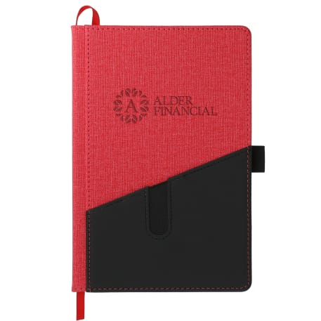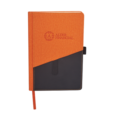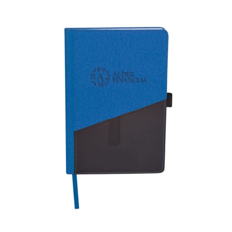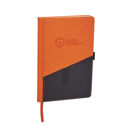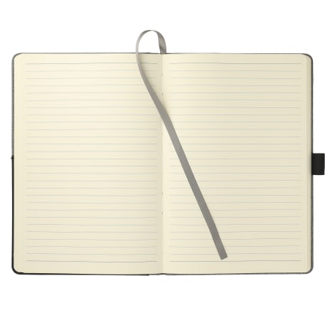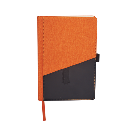 Heathered PU hard cover bound journal with front pocket for holding a smartphone, business cards or documents. Elastic pen loop, back document pocket and ribbon page marker. 80 sheets of cream lined paper.