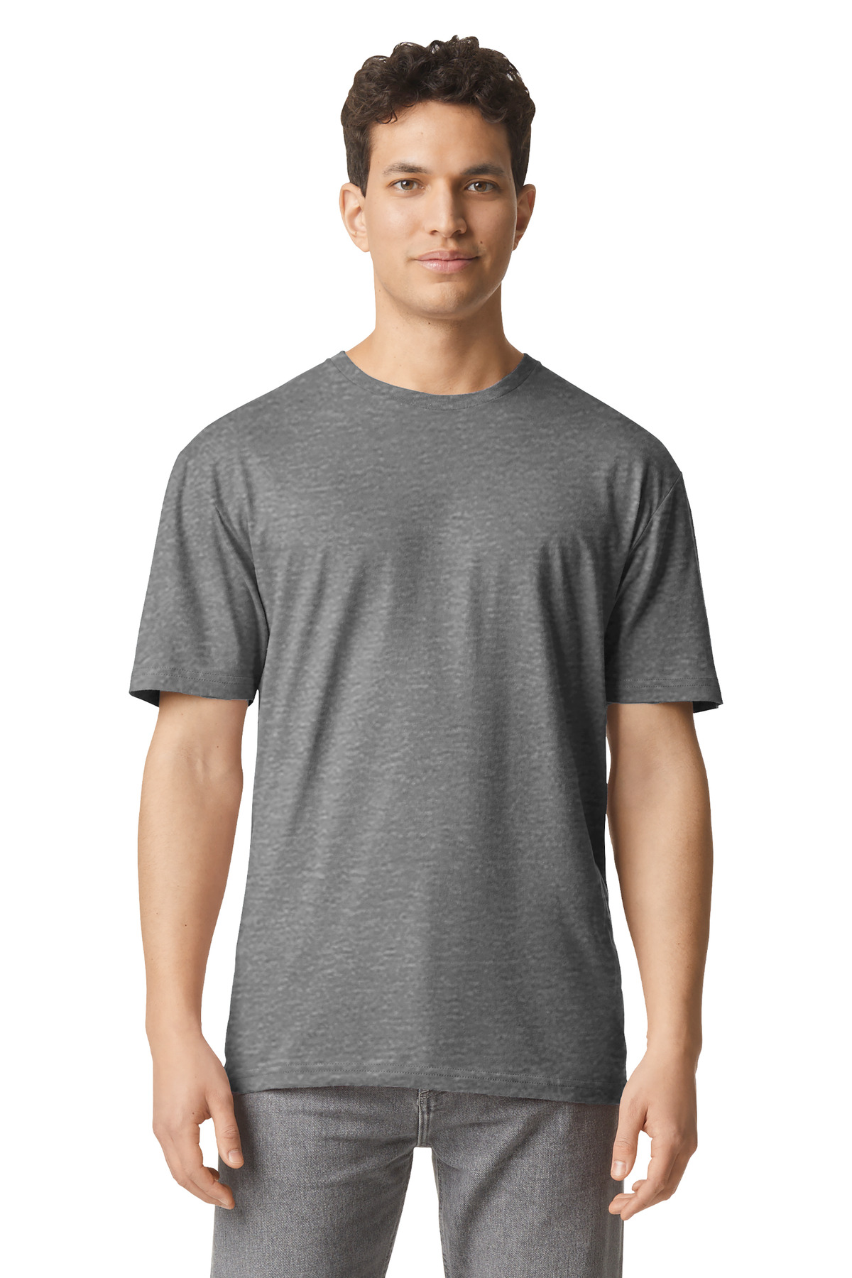 4.45-ounce 100% US cotton90/10 cotton/polyester (Sport Grey)50/50 cotton/polyester (Heathers)Non-dyed fabric with visible specks of fibers and cotton seeds (Natural)Narrow width rib collarTaped neck and shouldersModern classic fit seamless bodyRecycled high-performing black tear-away label