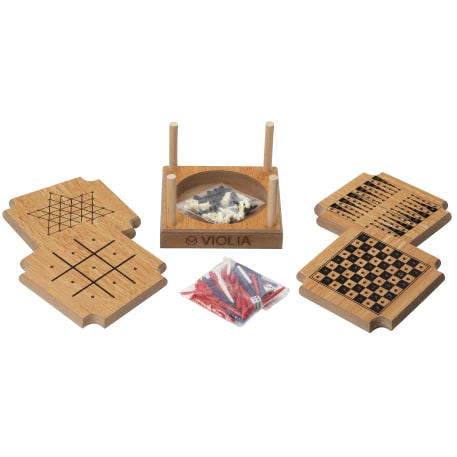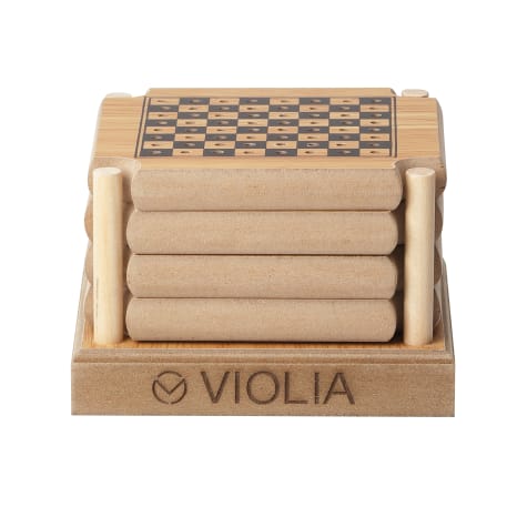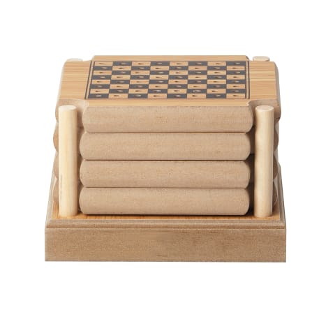 The 4 Coaster Game Set includes family favorite games in coaster form. Games included are Tic-Tac-Toe, Backgammon, Chess, and Chinese Checkers. All game pieces are stored under the coasters in the holder. Instructions included.