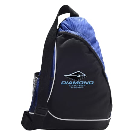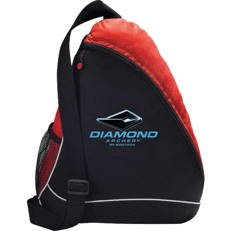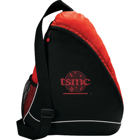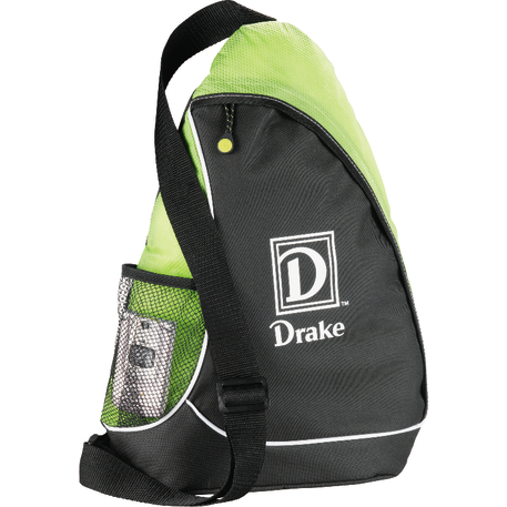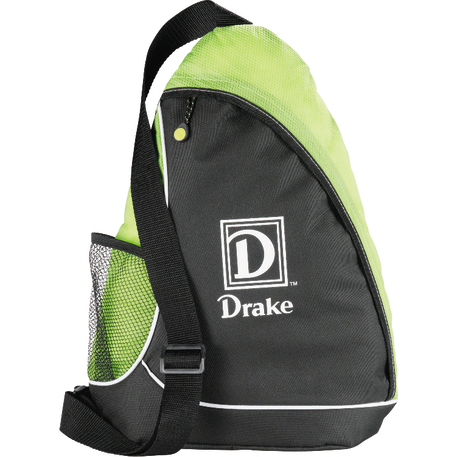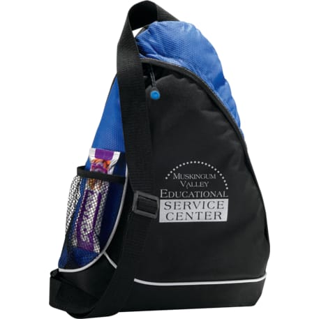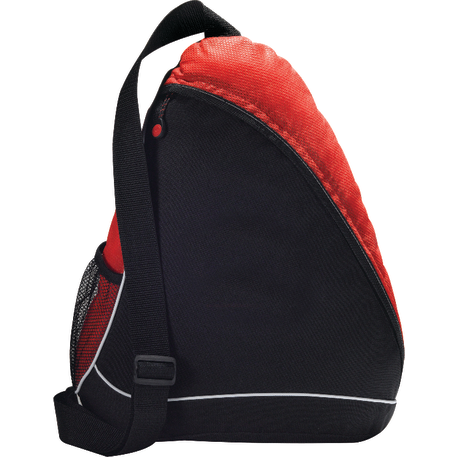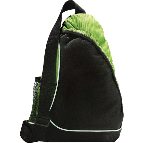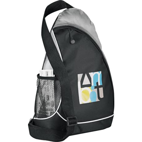 The Sling Shot Sling Backpack features a main zippered compartment, a side mesh water bottle pocket and an adjustable cross-over shoulder strap.
