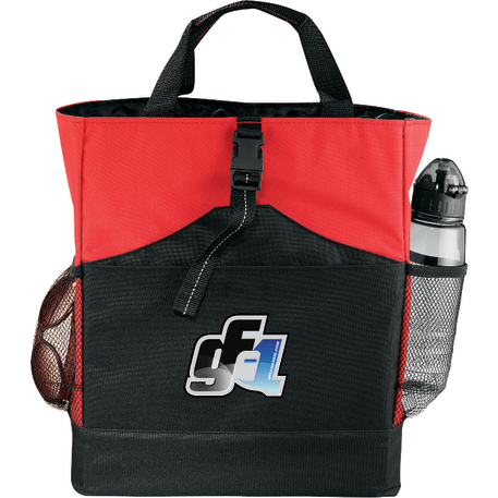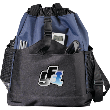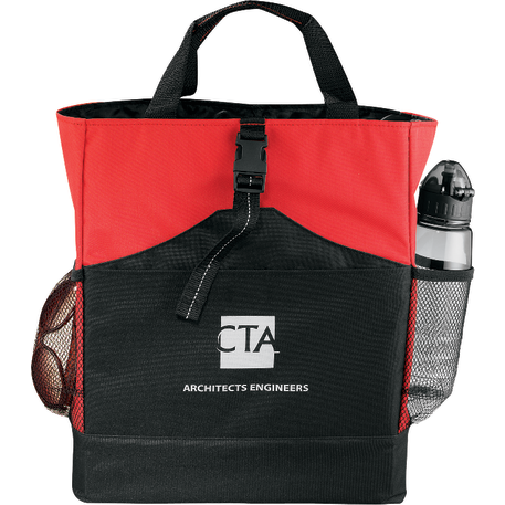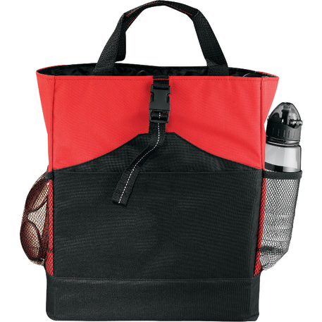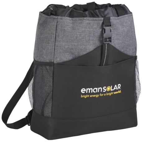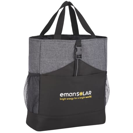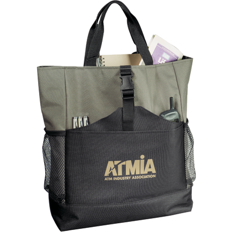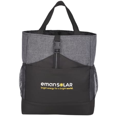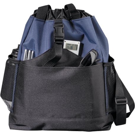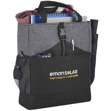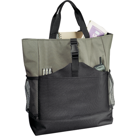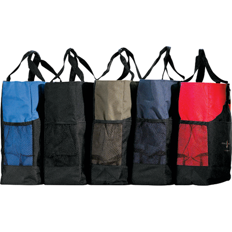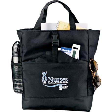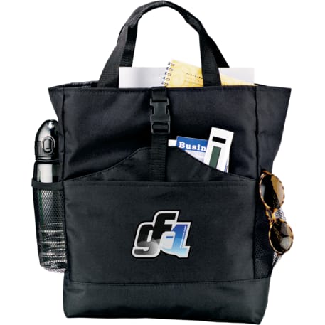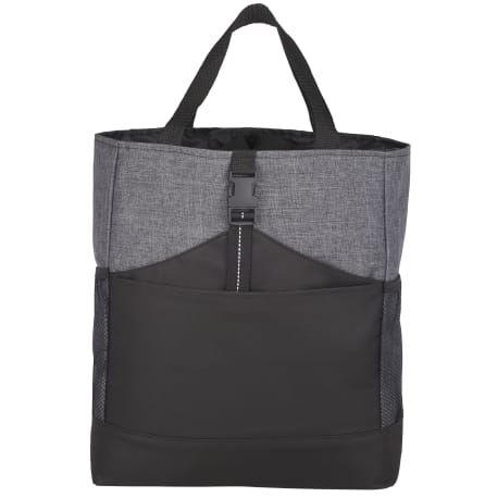 Transforms into either a tote or a backpack. Large main compartment. Open front pocket with organizer and clip closure. Two mesh side pockets. Adjustable shoulder straps unclip and fit inside bag when not in use. 4" tote handle drop height.