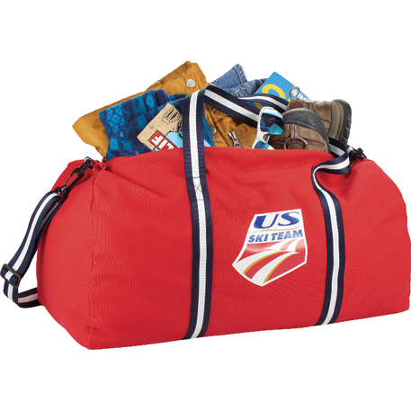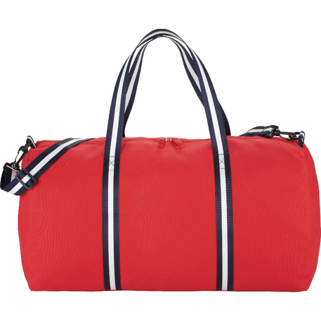 This iconic cotton weekender style is the perfect travel bag for your next adventure. Contrast stripe cotton webbing gives this classic a fresh look. Large zippered main compartment will hold all your clothes and gear. Detachable, adjustable striped cotton shoulder strap.