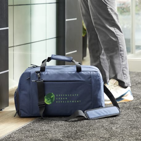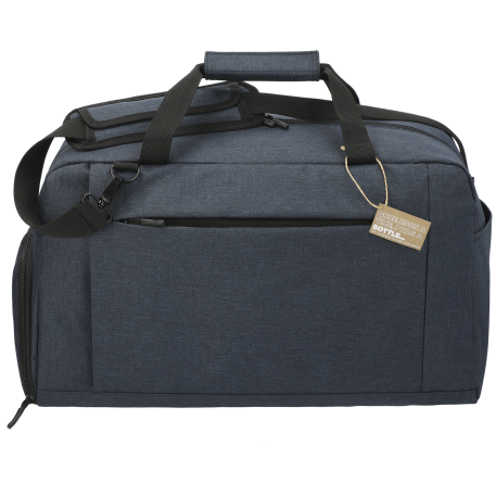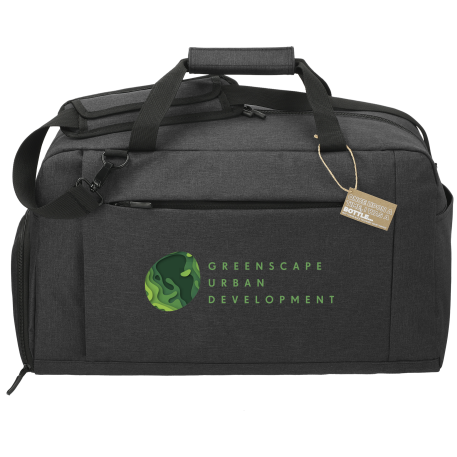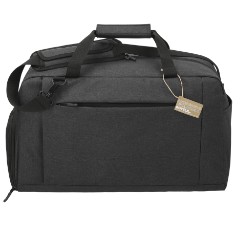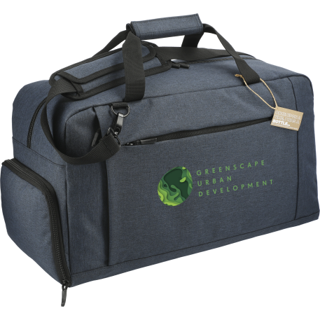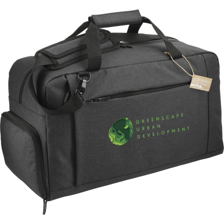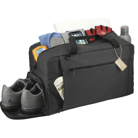 The AFT Recycled 21" Duffel is ready to travel with you whether it's on vacation, to the gym, or office. This duffel features a roomy zippered main compartment for all your essentials. Get extra storage with the side zippered shoe compartment, two zippered front pockets, and side water bottle pocket. Carry with ease with the adjustable, removeable shoulder strap, and the padded grab handle. This duffel is made from recycled water bottles. Through a partnership with 1% For The Planet, one percent of sales of this and all EcoSmart products will be donated to nonprofits dedicated to protecting the planet.